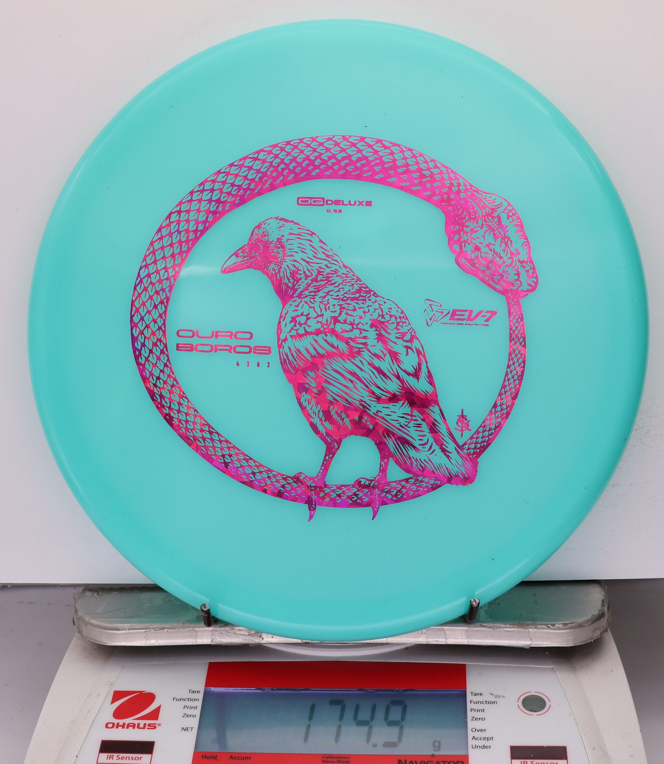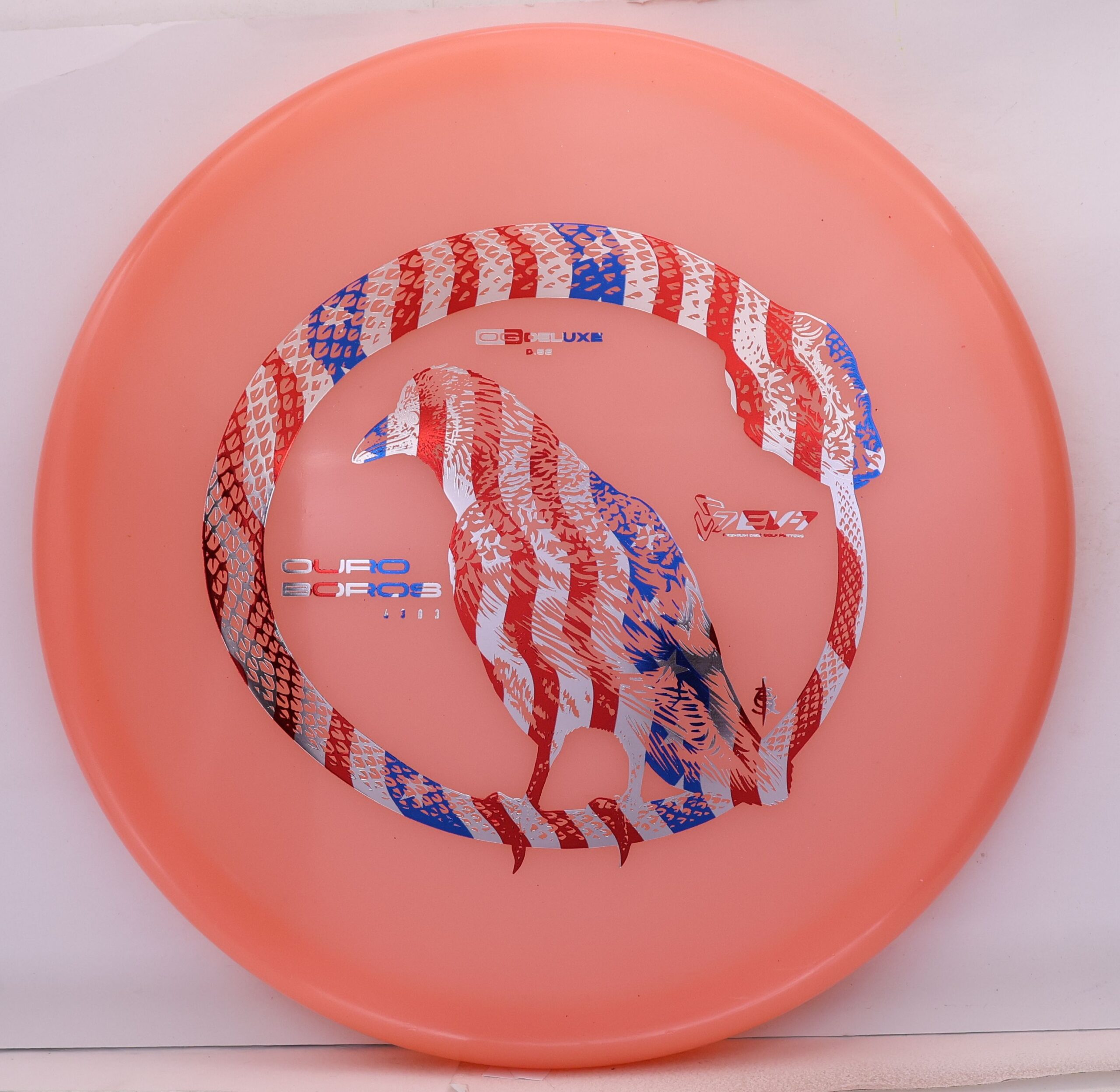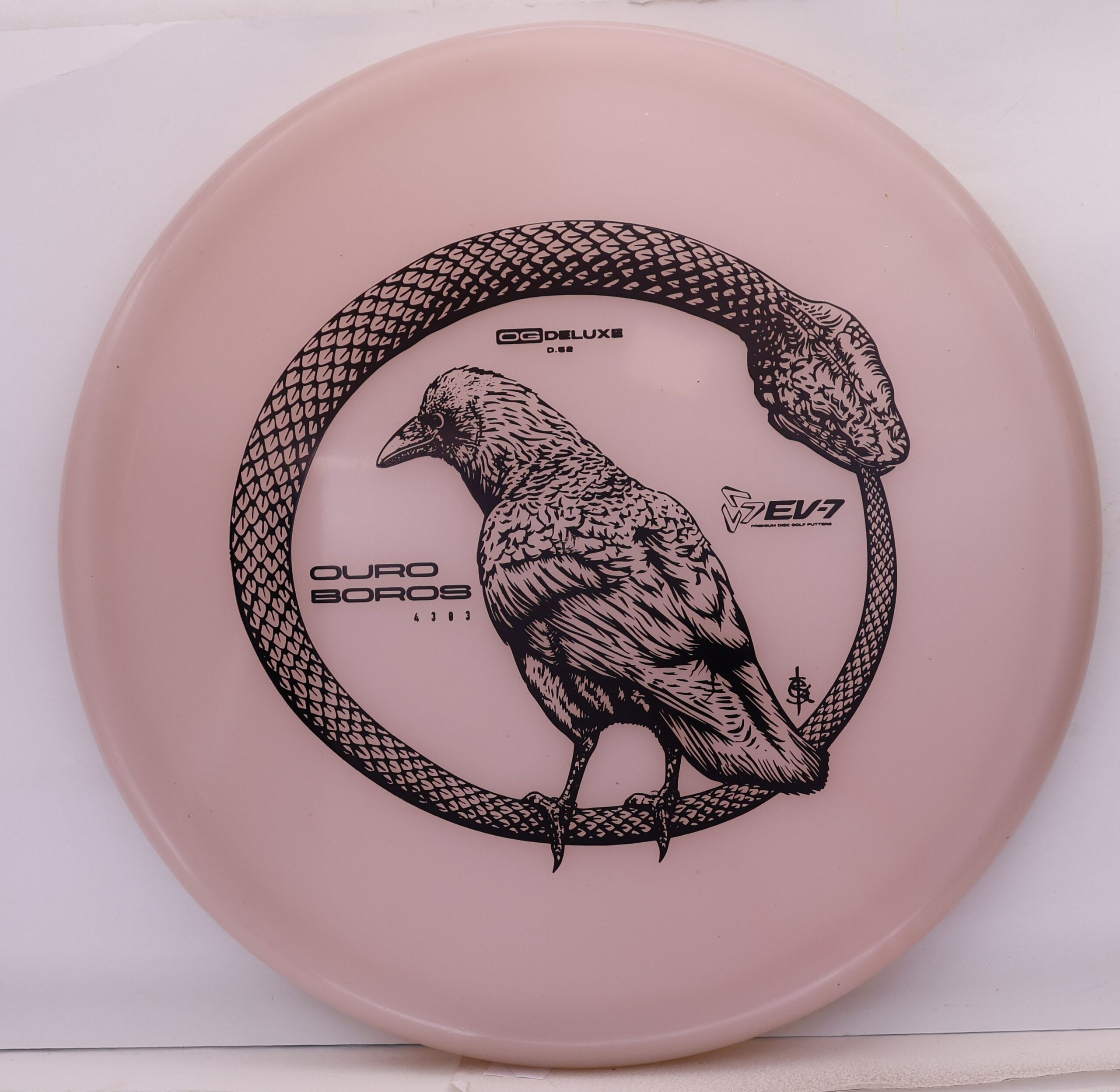 The EV-7 Ouroboros in OG Deluxe offers a firmer feel than Deluxe Soft while maintaining good grip. It resists turn, carries forward on a short, straight line, then finishes with a pronounced fade. Ground play is moderate, with more skip than softer blends but less than OG Firm. A balanced option for players who want durability, clean release, and controlled finishes.