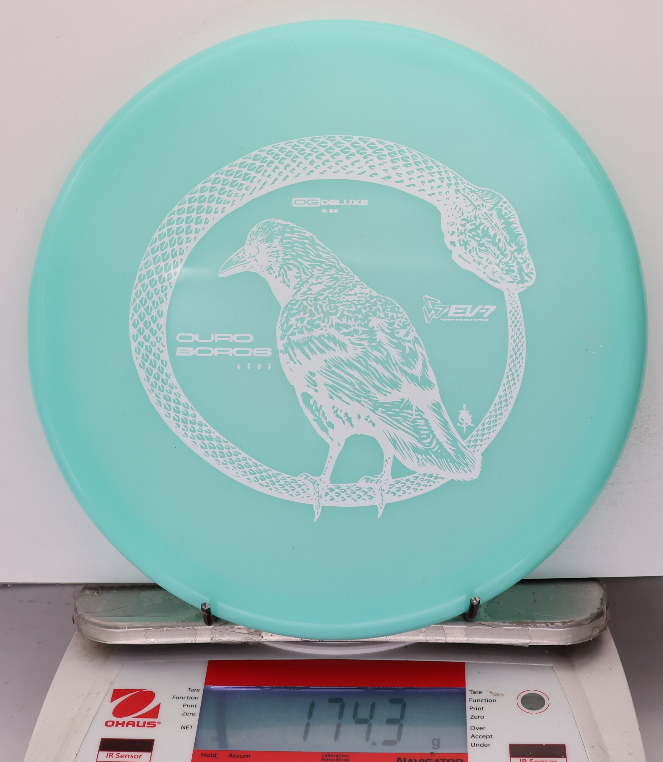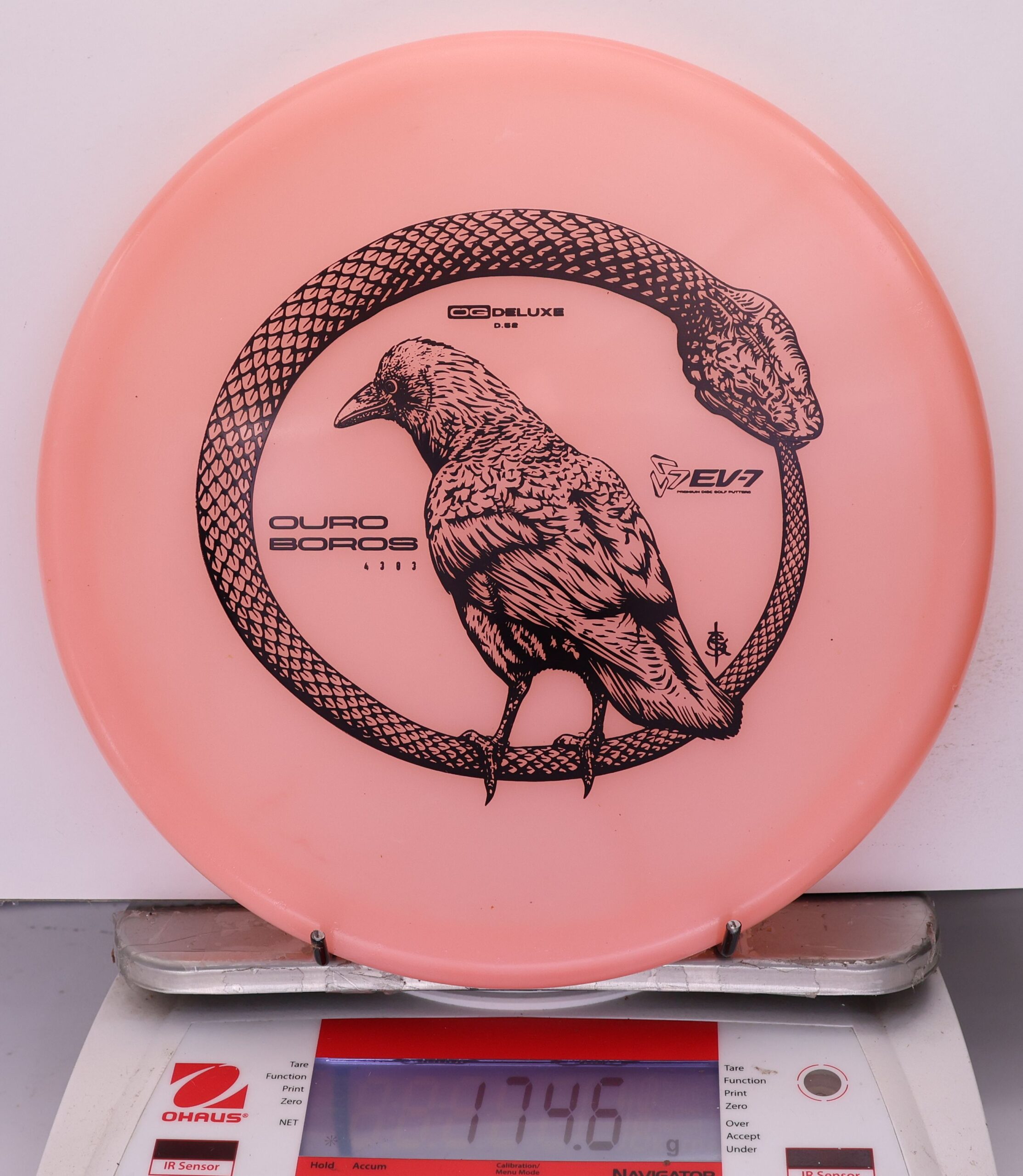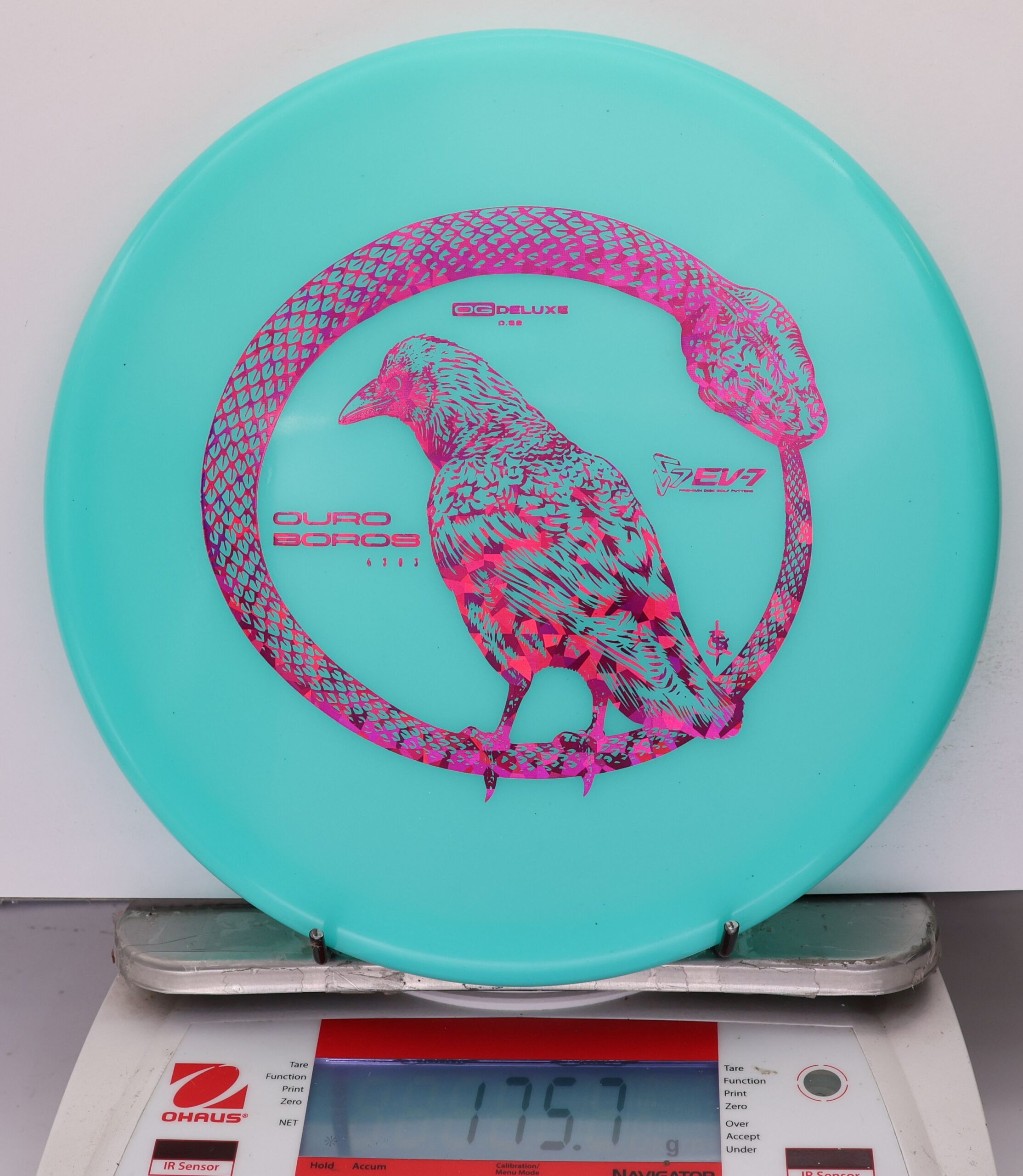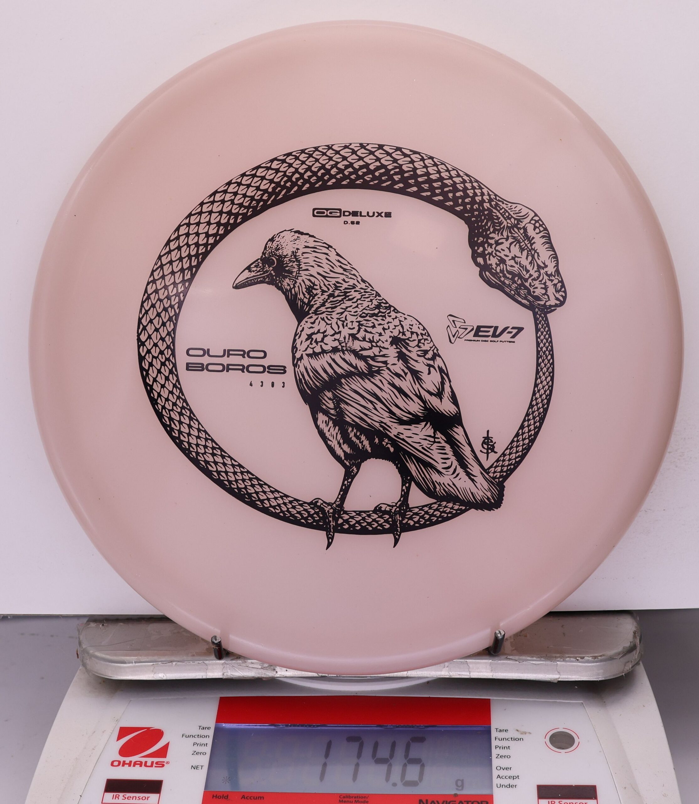 The EV-7 Ouroboros in OG Deluxe offers a firmer feel than Deluxe Soft while maintaining good grip. It resists turn, carries forward on a short, straight line, then finishes with a pronounced fade. Ground play is moderate, with more skip than softer blends but less than OG Firm. A balanced option for players who want durability, clean release, and controlled finishes.
