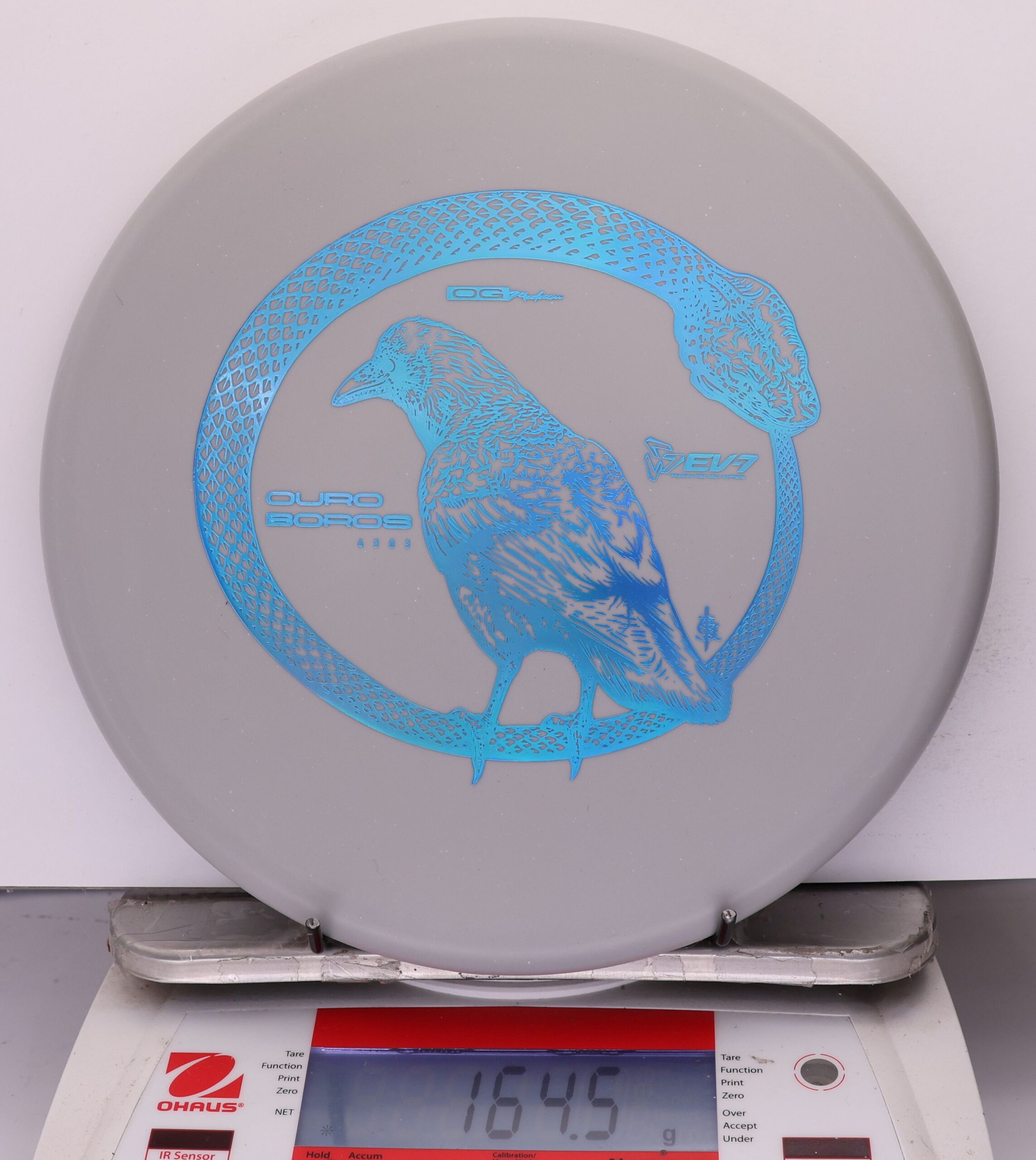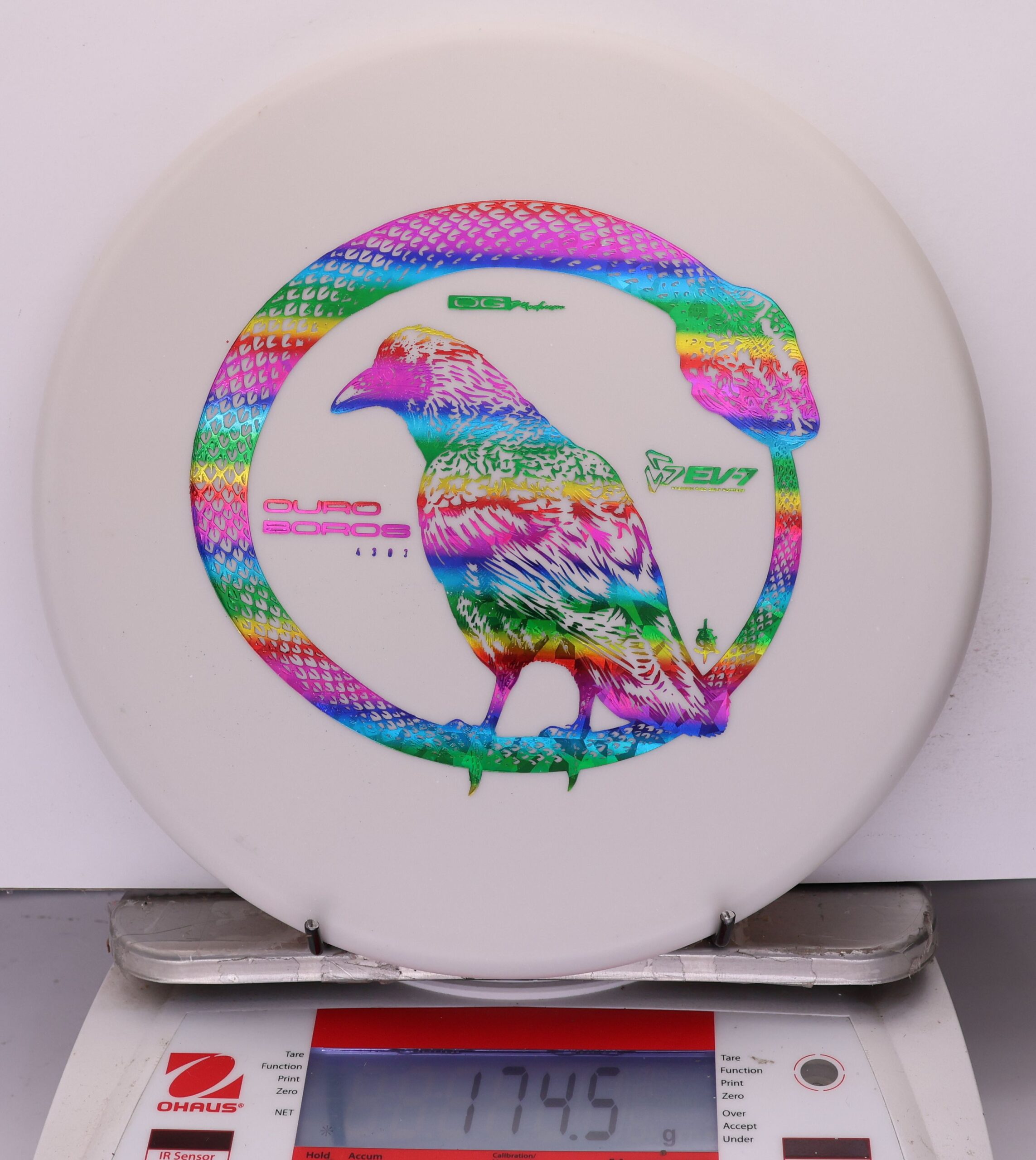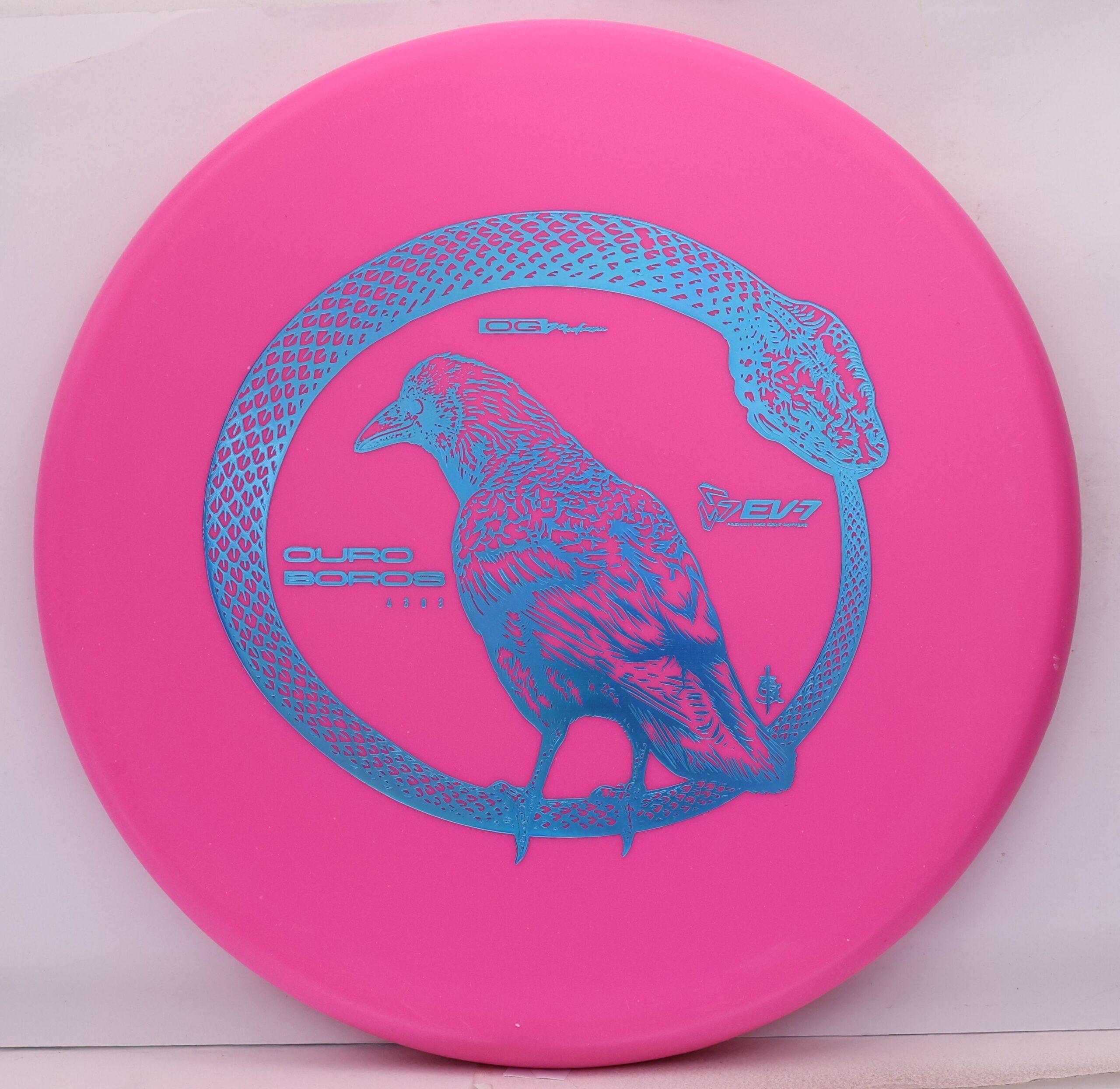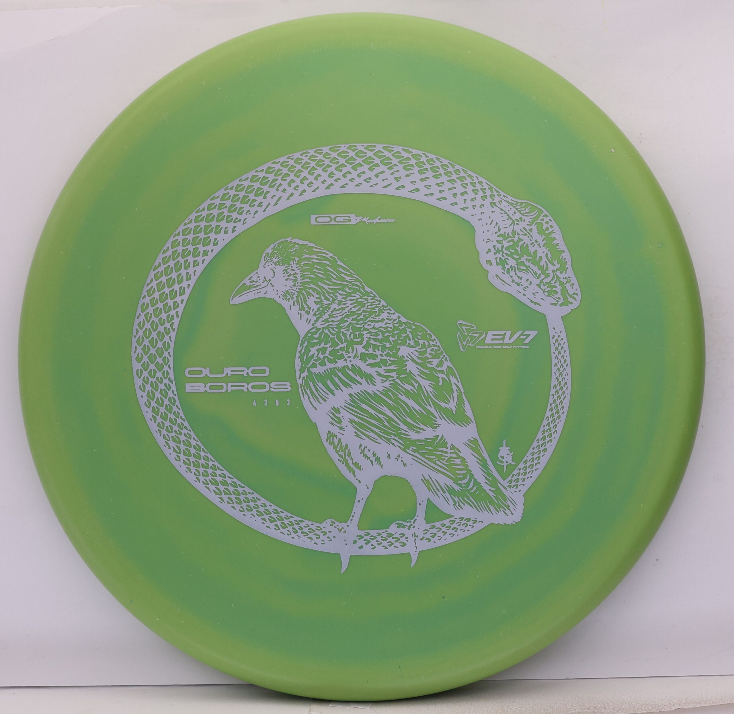The EV-7 Ouroboros in OG Medium sits between soft and firm blends, offering a slightly flexible feel with solid grip. It resists high-speed turn, tracks straight for a short portion of flight, then finishes with a pronounced fade. Compared to OG Soft, it allows a bit more skip, while still reducing ground action versus firmer plastics on most approach shots.