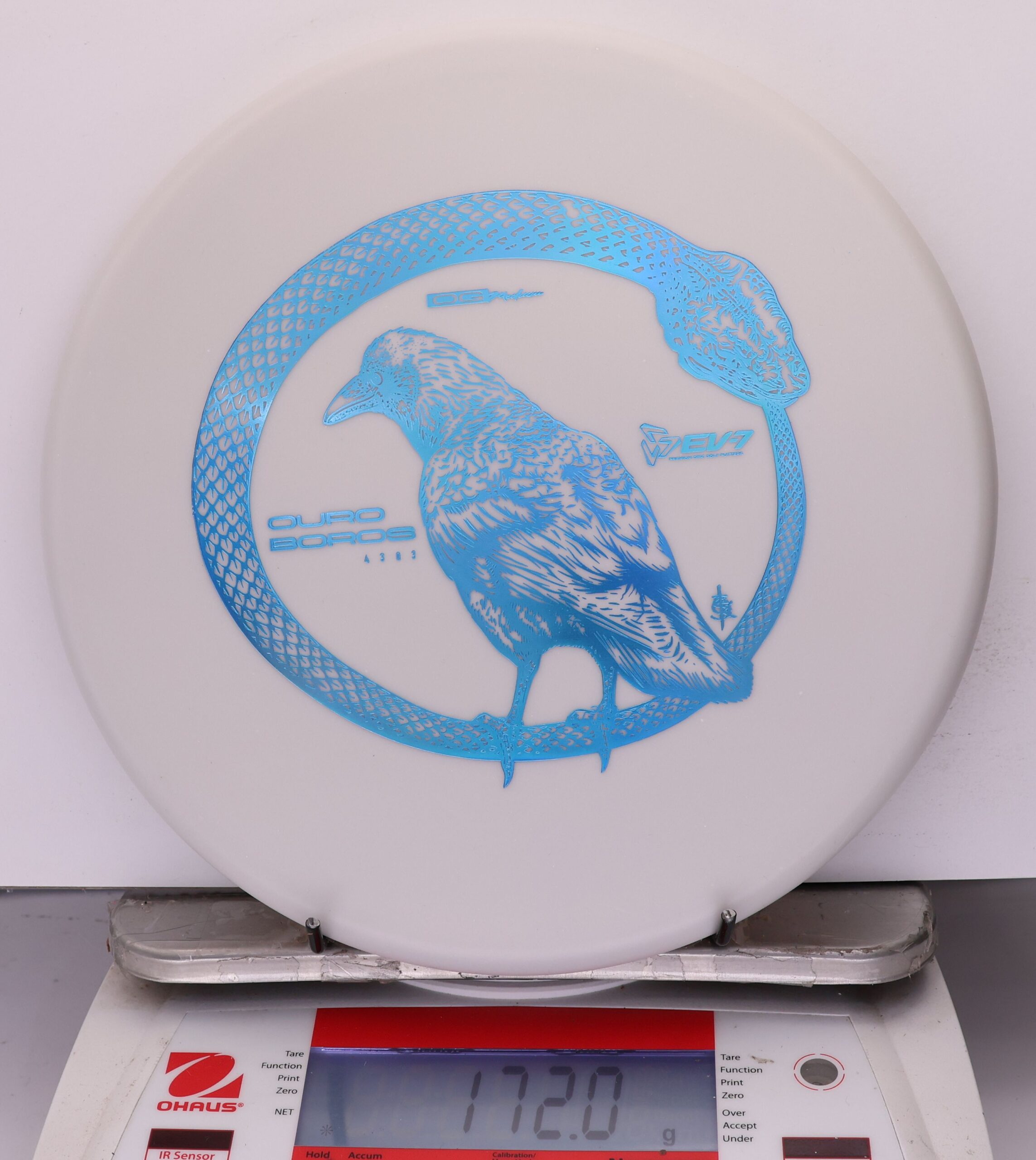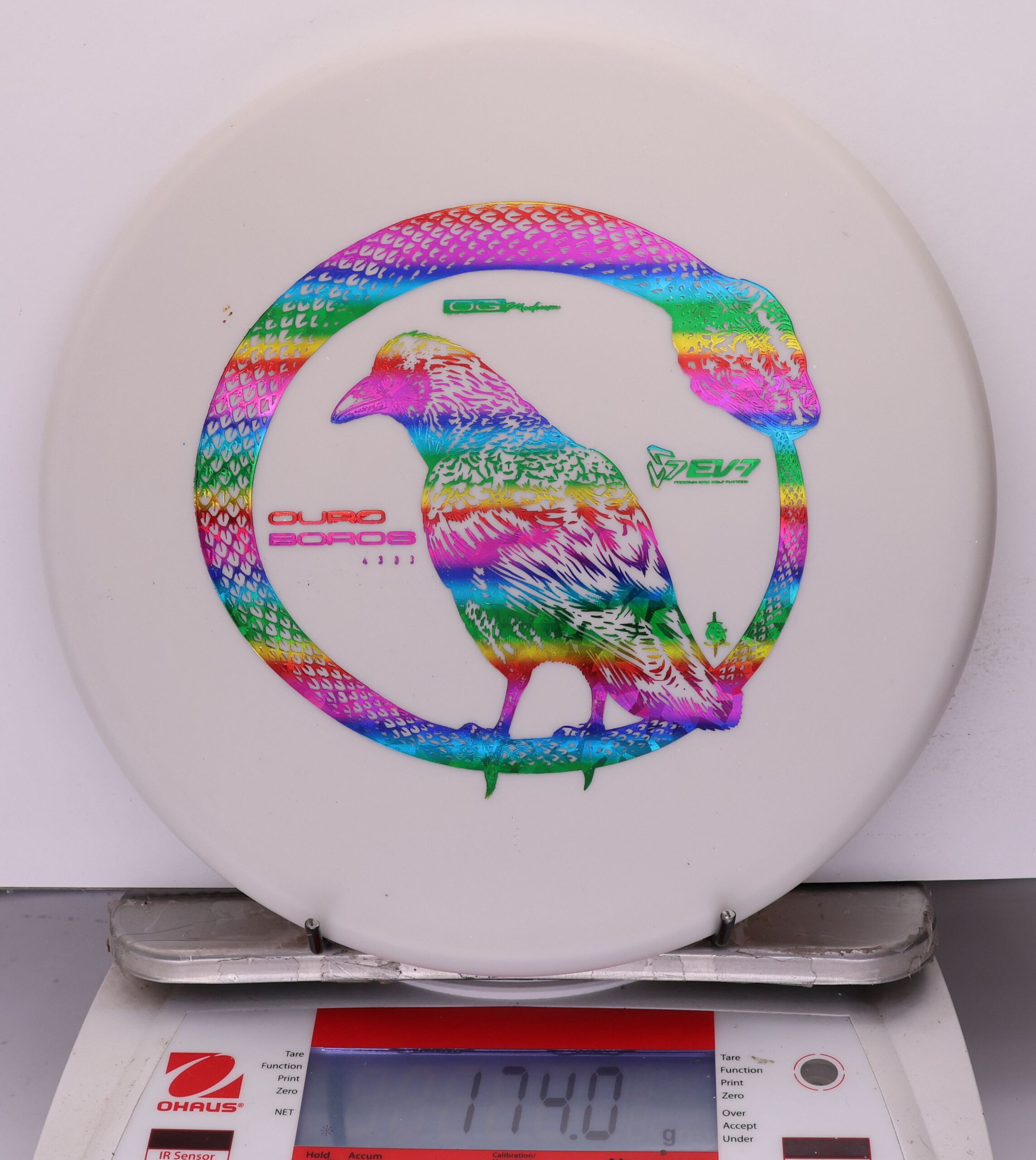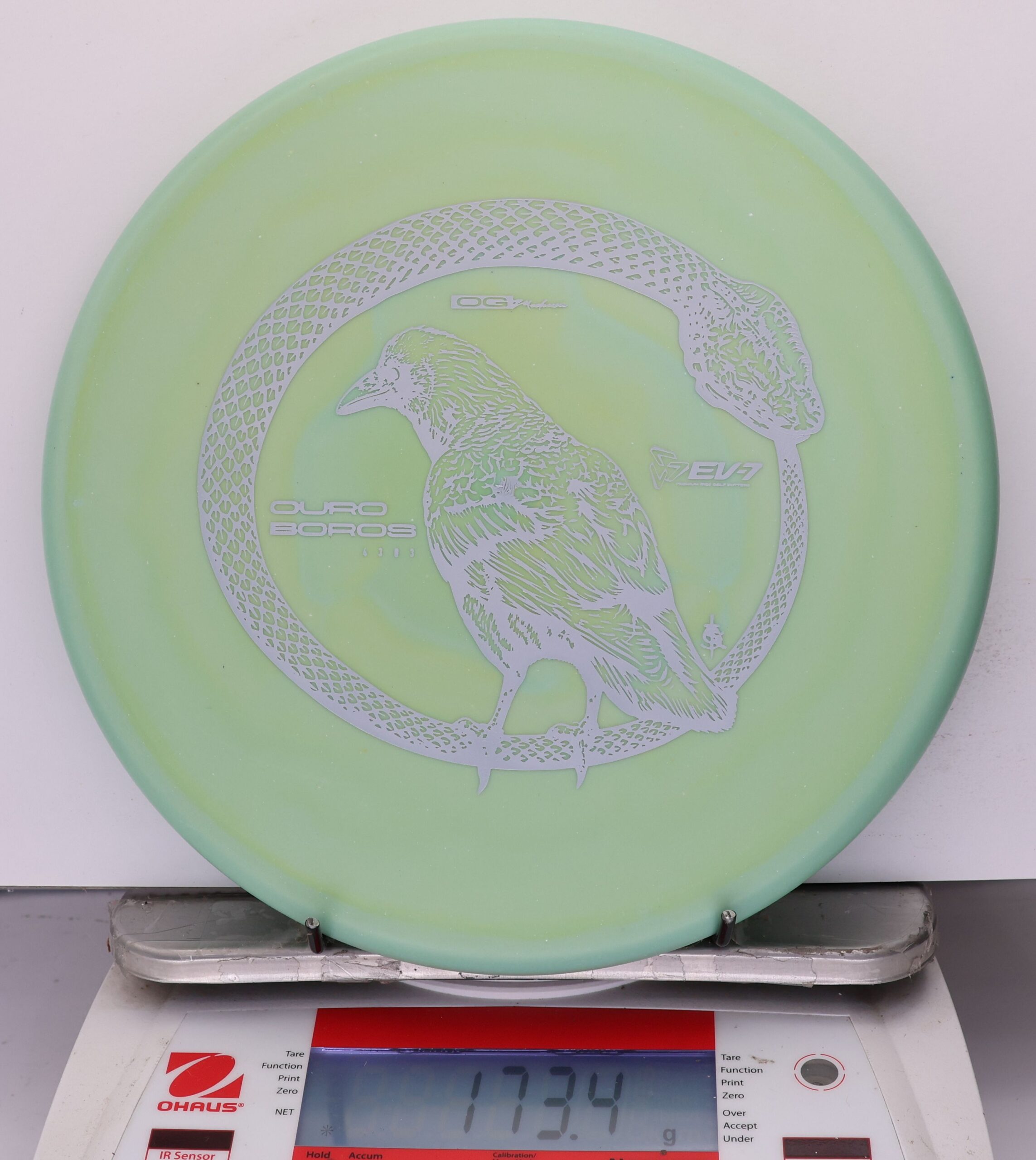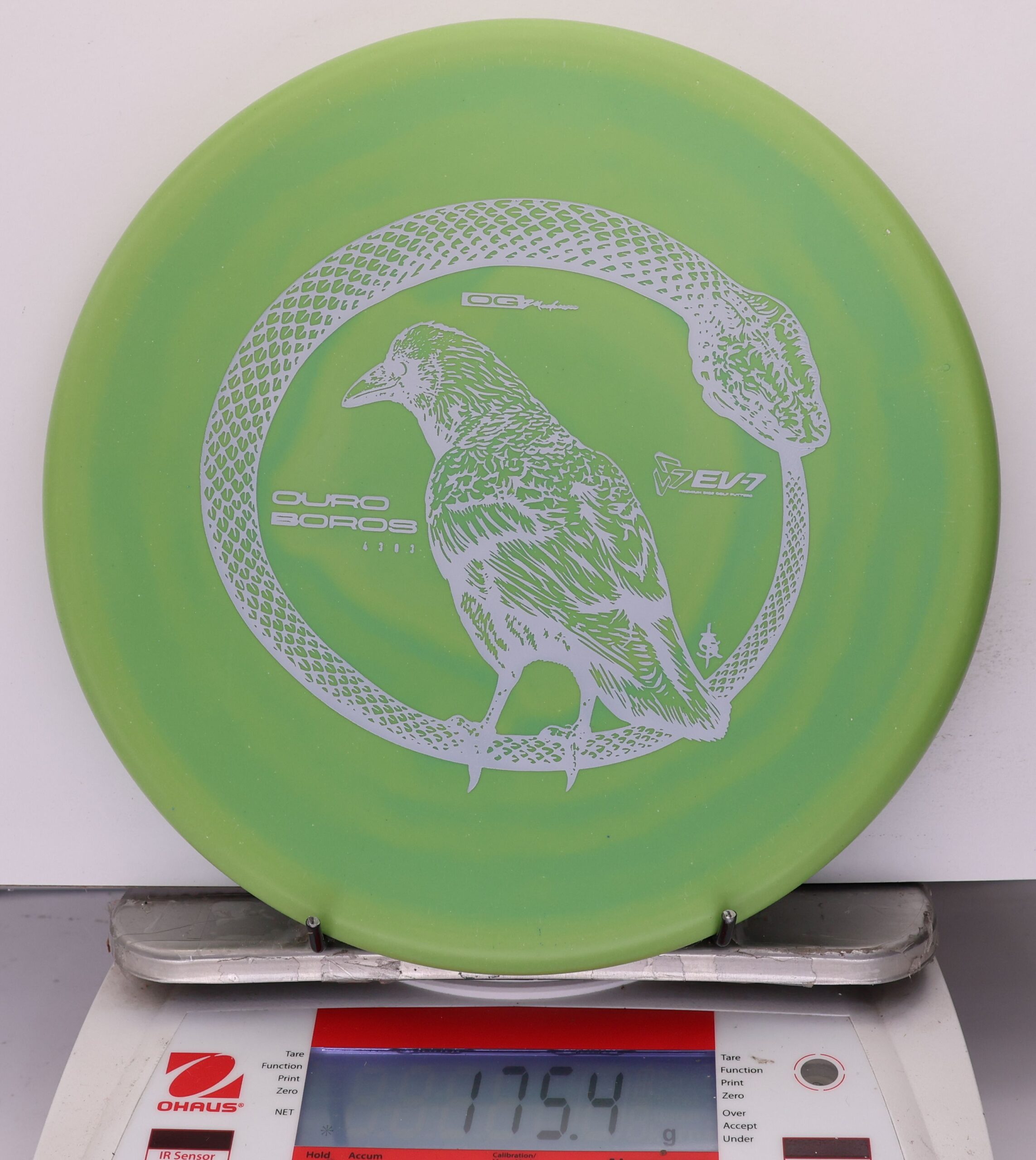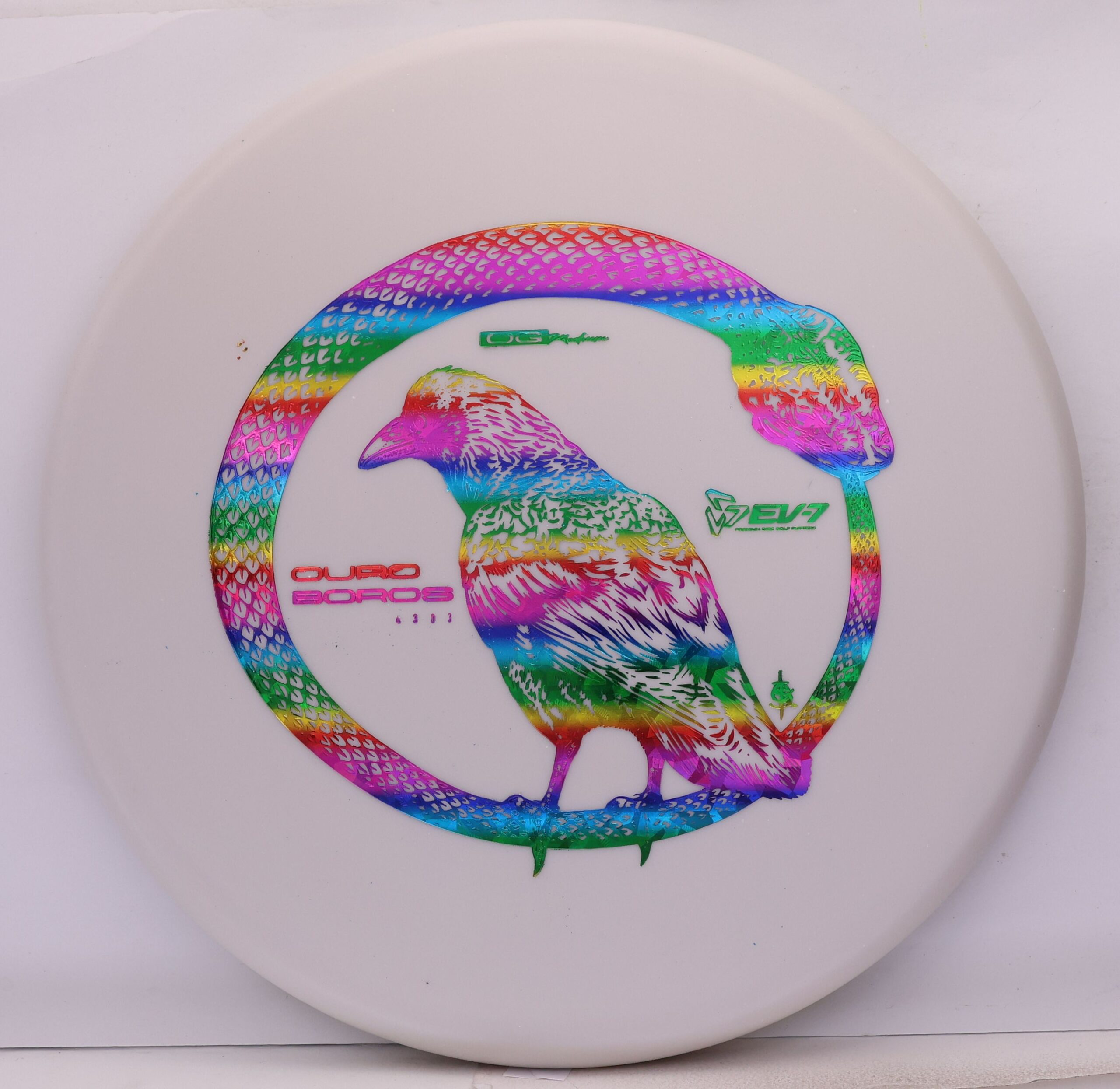 The EV-7 Ouroboros in OG Medium sits between soft and firm blends, offering a slightly flexible feel with solid grip. It resists high-speed turn, tracks straight for a short portion of flight, then finishes with a pronounced fade. Compared to OG Soft, it allows a bit more skip, while still reducing ground action versus firmer plastics on most approach shots.