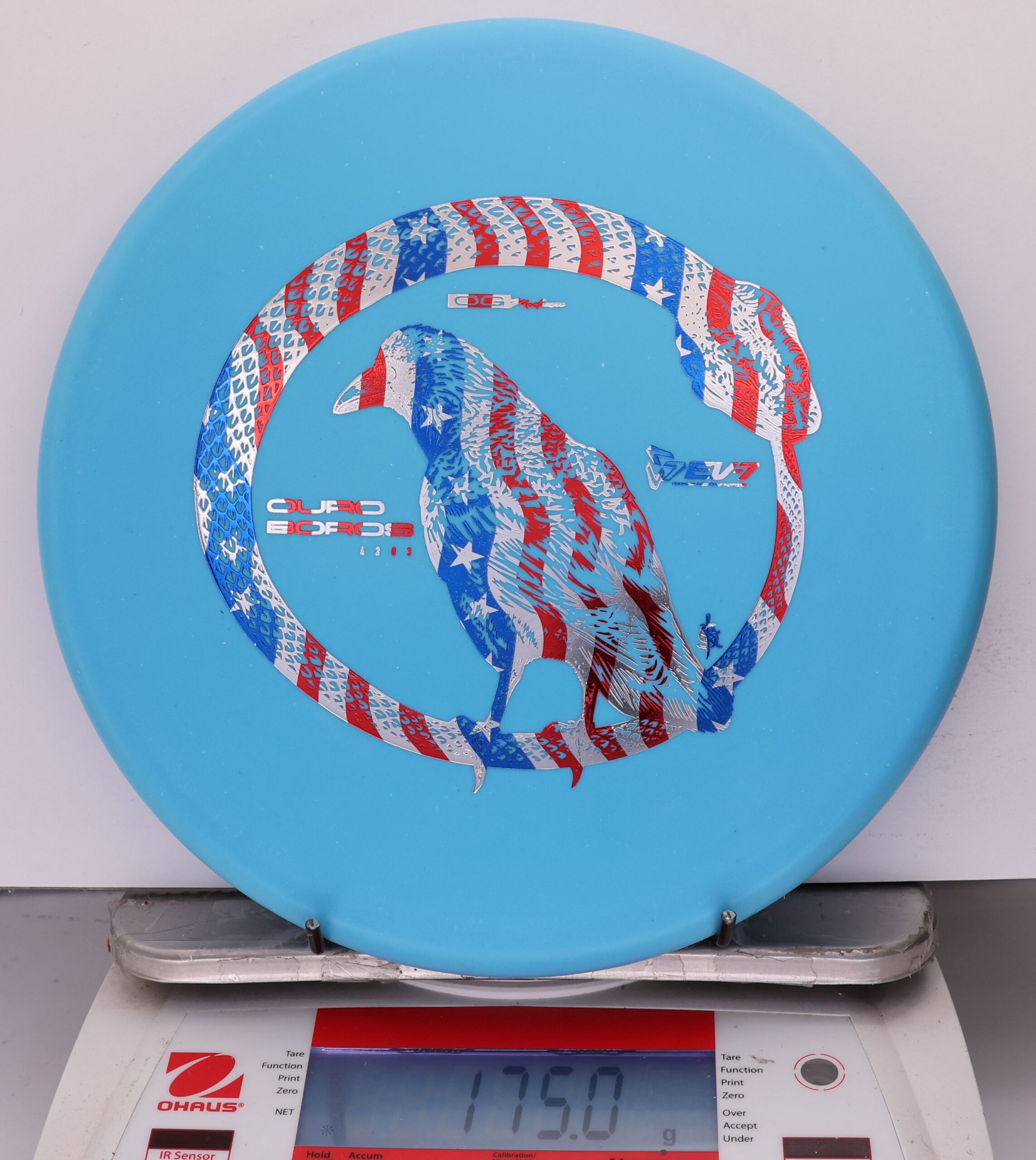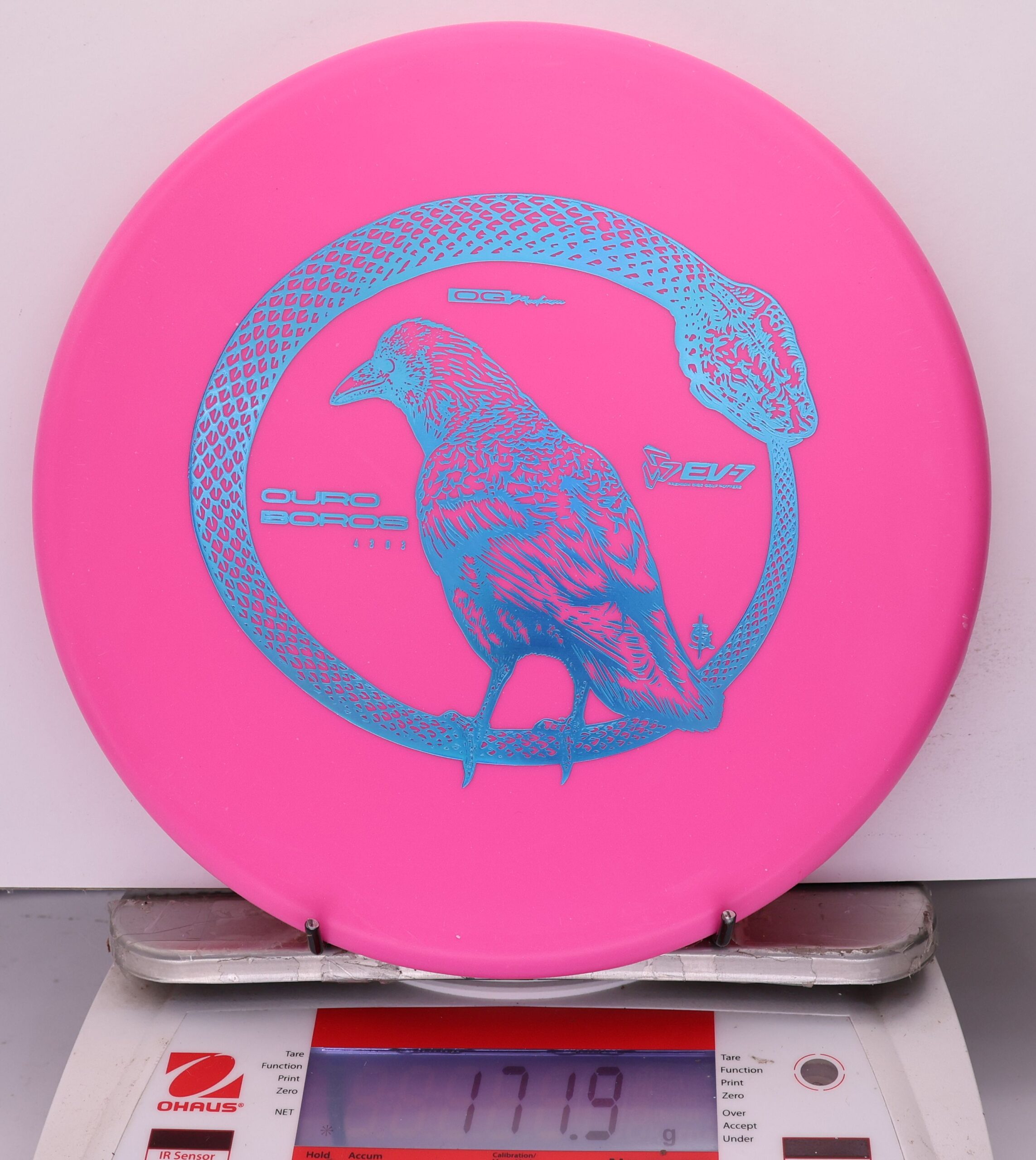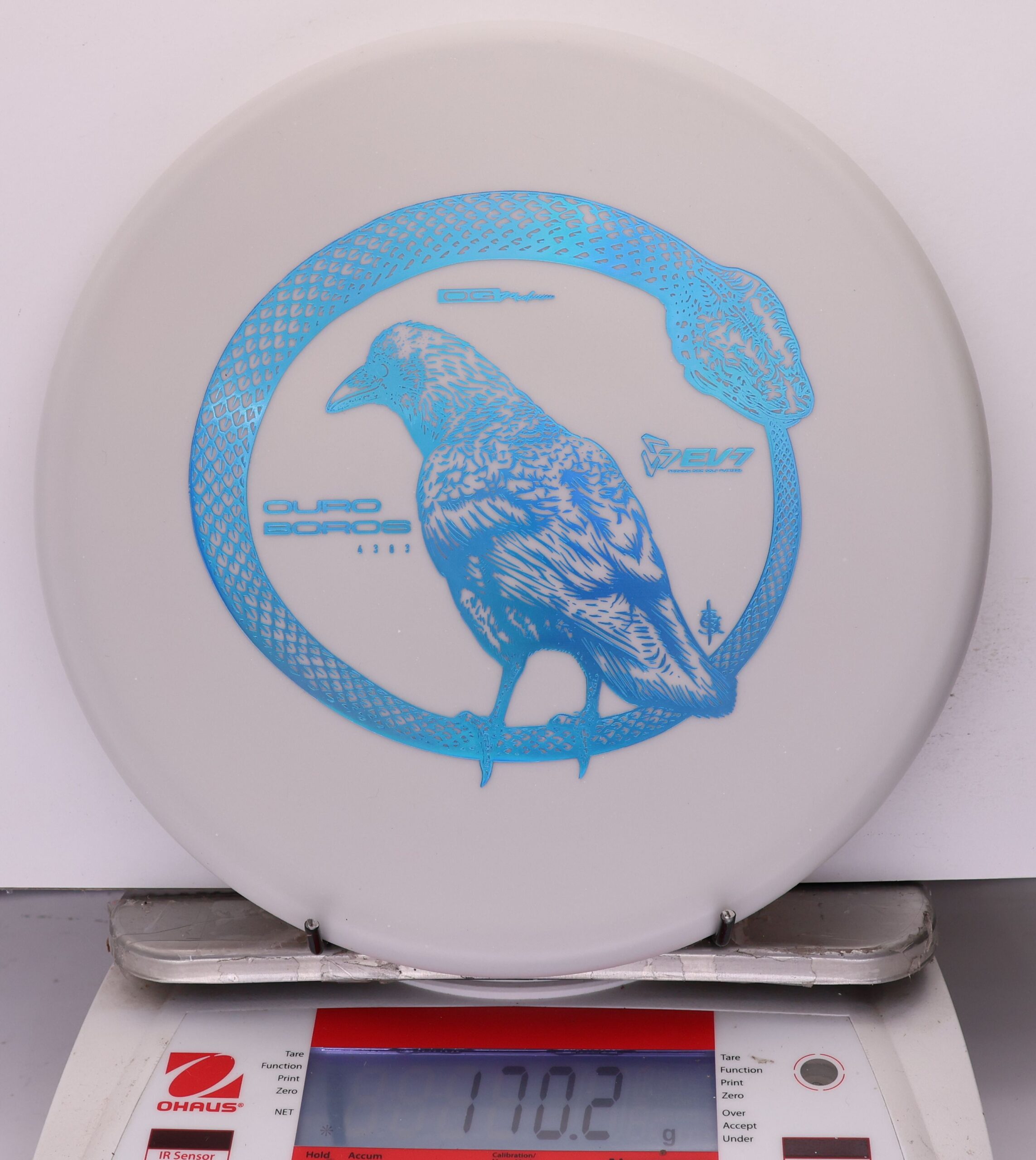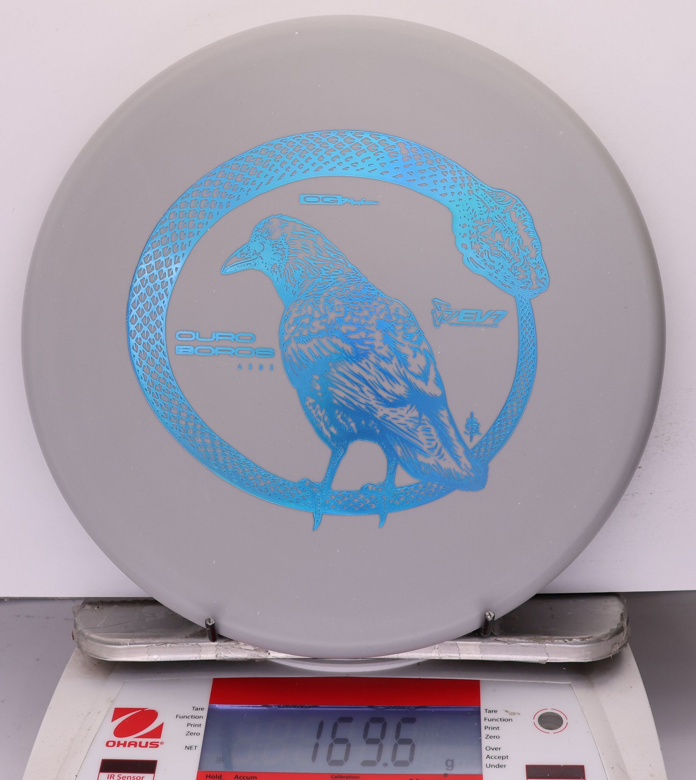 The EV-7 Ouroboros in OG Medium sits between soft and firm blends, offering a slightly flexible feel with solid grip. It resists high-speed turn, tracks straight for a short portion of flight, then finishes with a pronounced fade. Compared to OG Soft, it allows a bit more skip, while still reducing ground action versus firmer plastics on most approach shots.