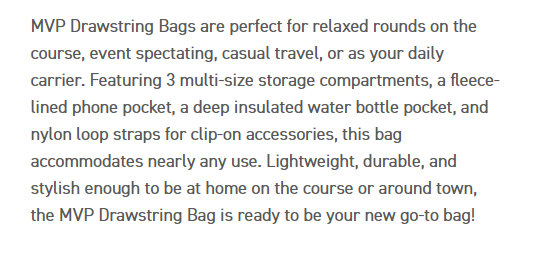 MVP Drawstring Bags are perfect for relaxed rounds on the course, event spectating, casual travel, or as your daily carrier. Featuring 3 multi-size storage compartments, a fleece-lined phone pocket, a deep insulated water bottle pocket, and nylon loop straps for clip-on accessories, this bag accommodates nearly any use. Lightweight, durable, and stylish enough to be at home on the course or around town, the MVP Drawstring Bag is ready to be your new go-to bag!