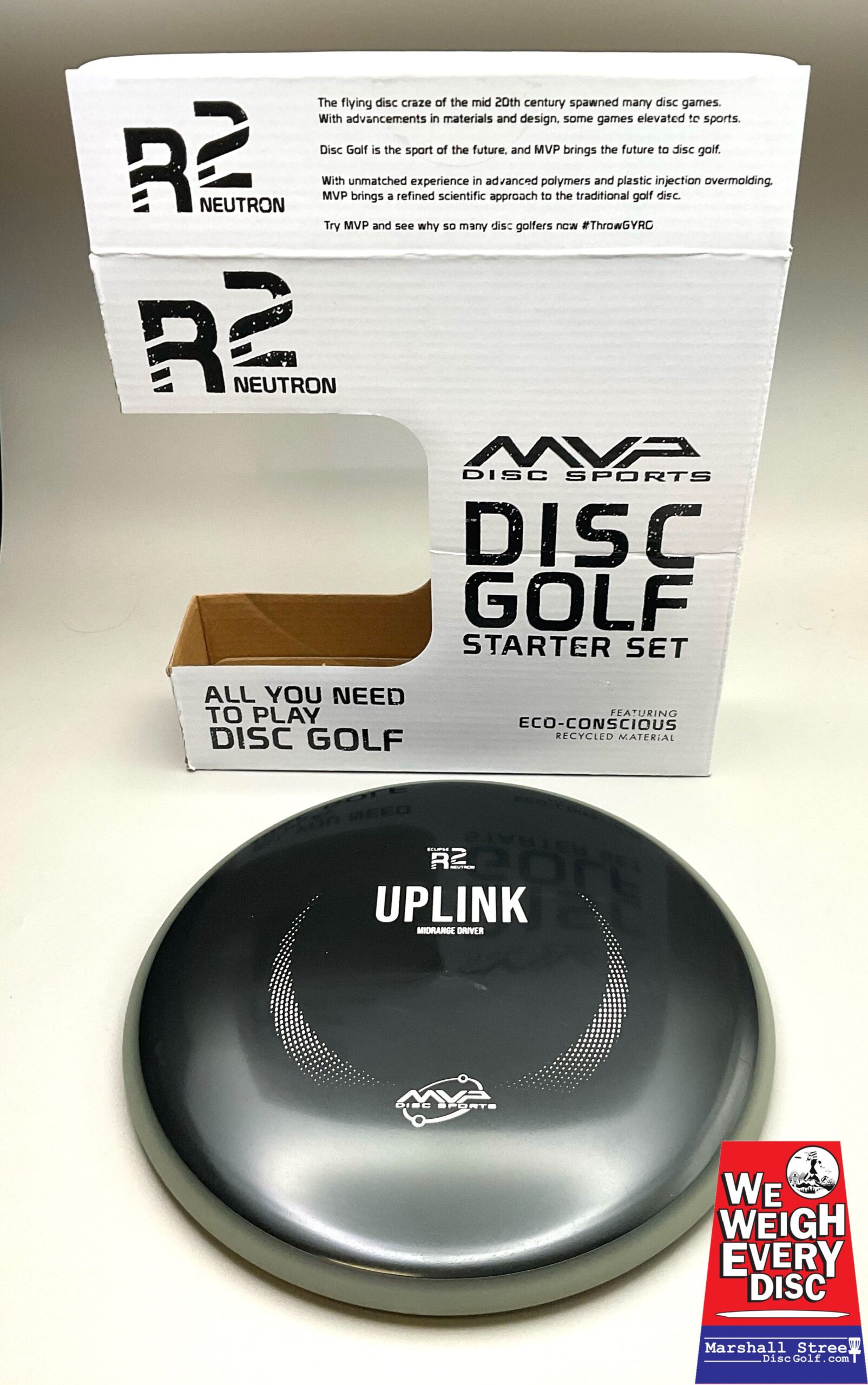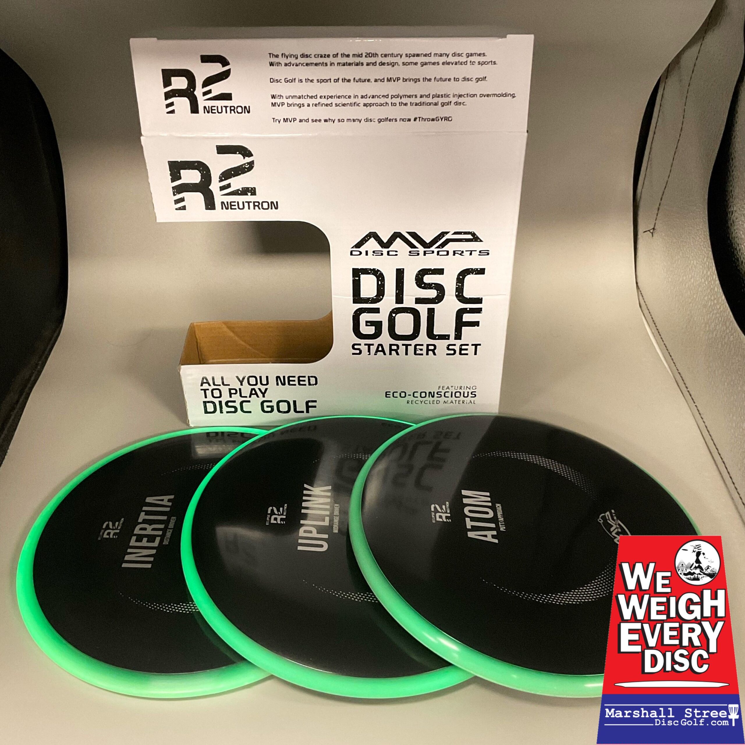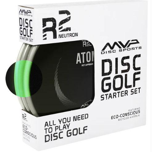 This Eclipse R2 Neutron Set comes equipped with an Inertia fairway driver (9/5/-2/2), an Uplink midrange (5/5/-3/0.5), and an Atom putter (3/3/-0.5/0).