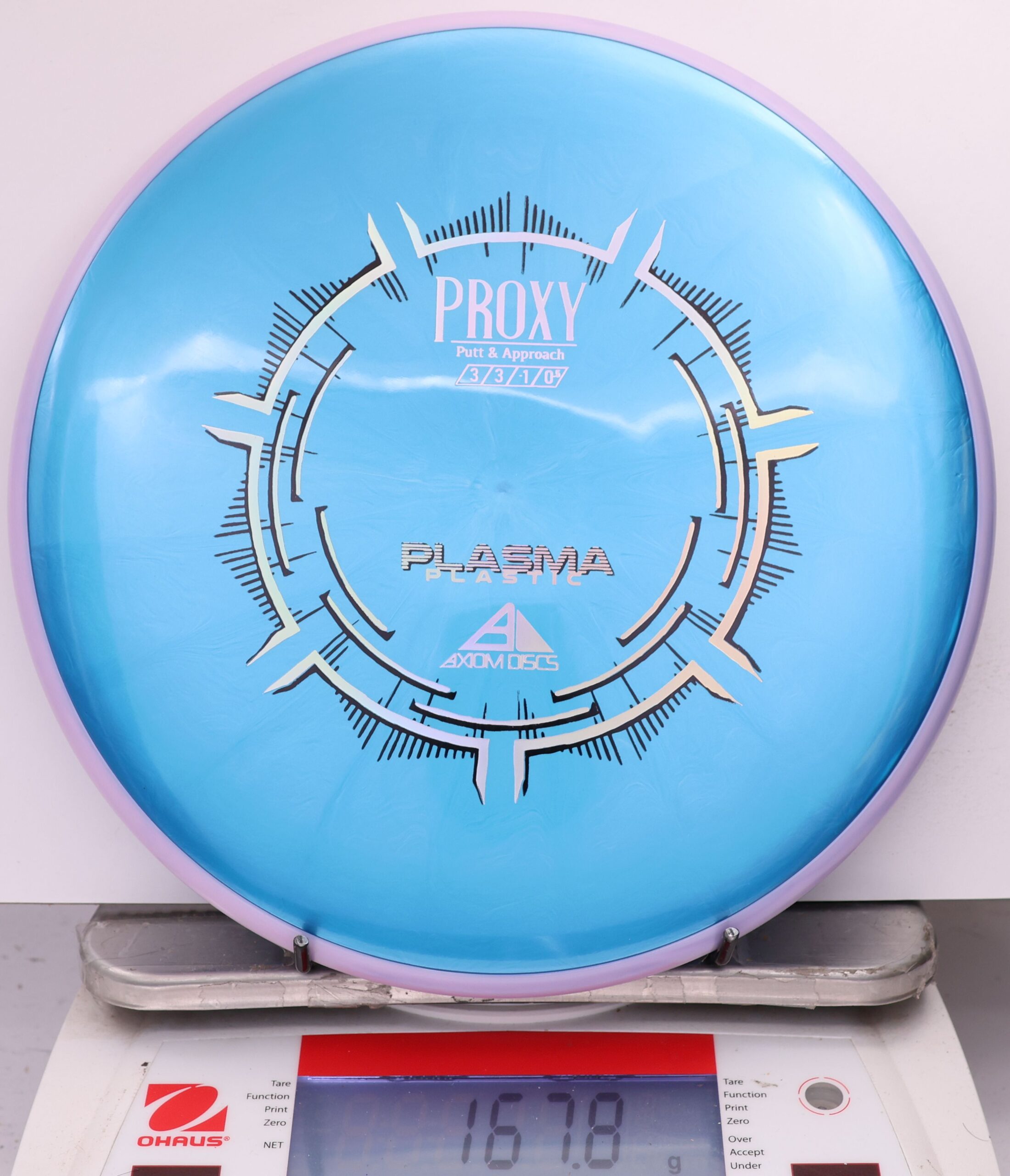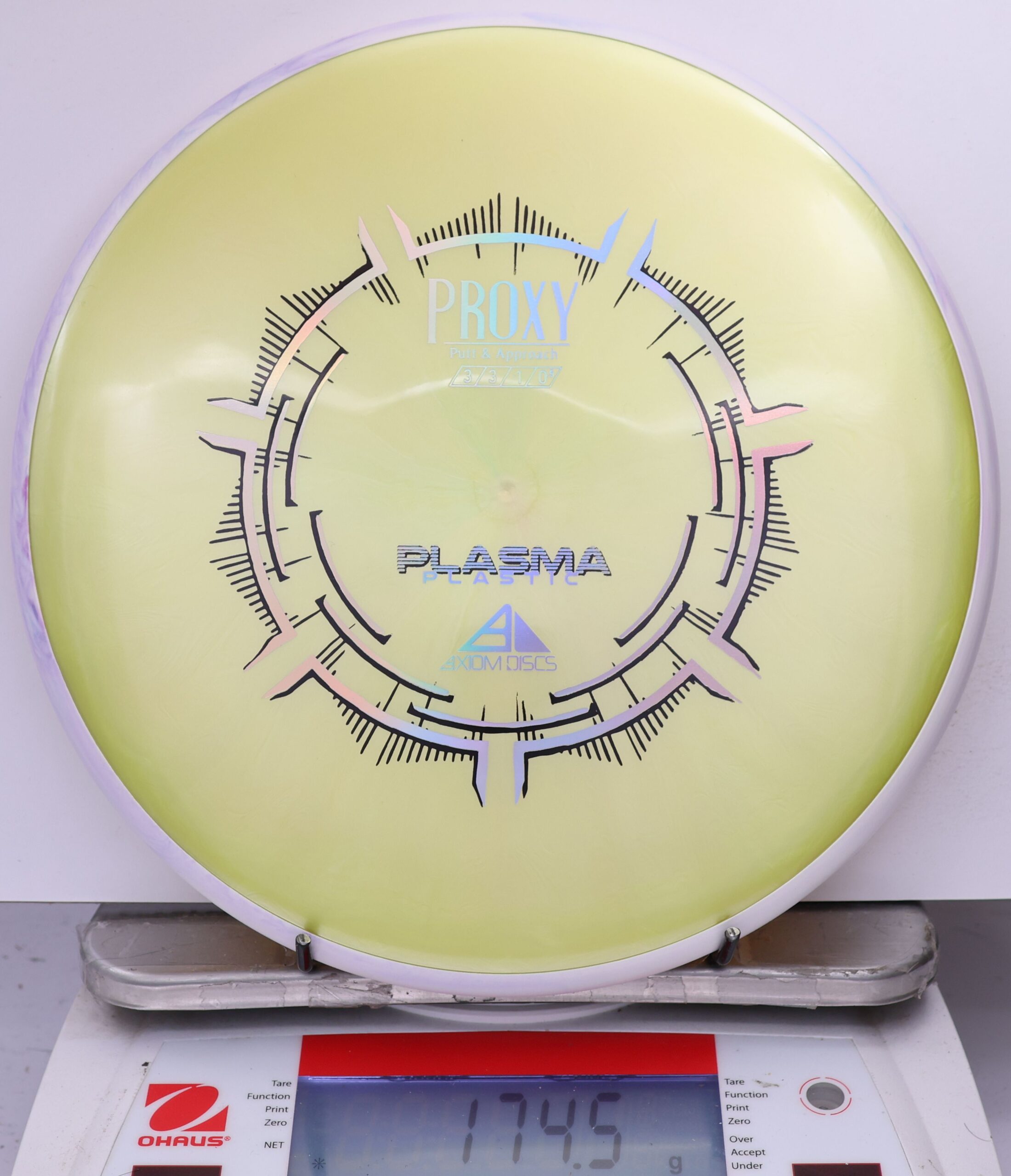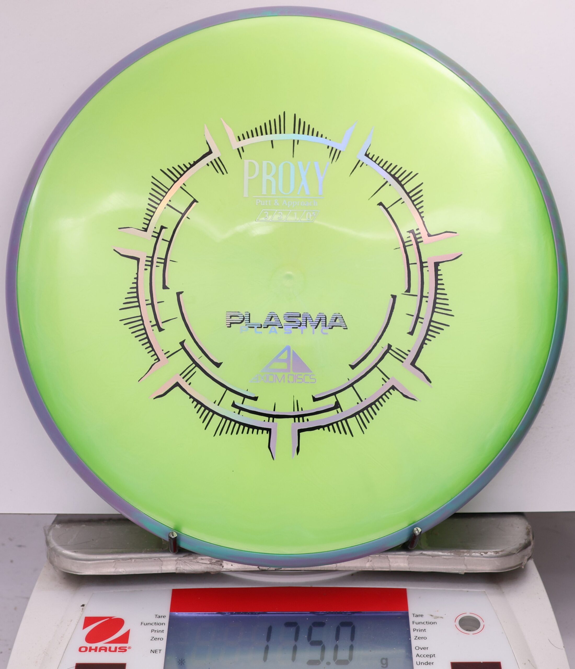 The Axiom Plasma Proxy is a straight-stable putt and approach disc with flight ratings of 3 | 3 | -1 | 0.5. It offers a low-profile feel and solid grip, making it ideal for precise throws and approaches.