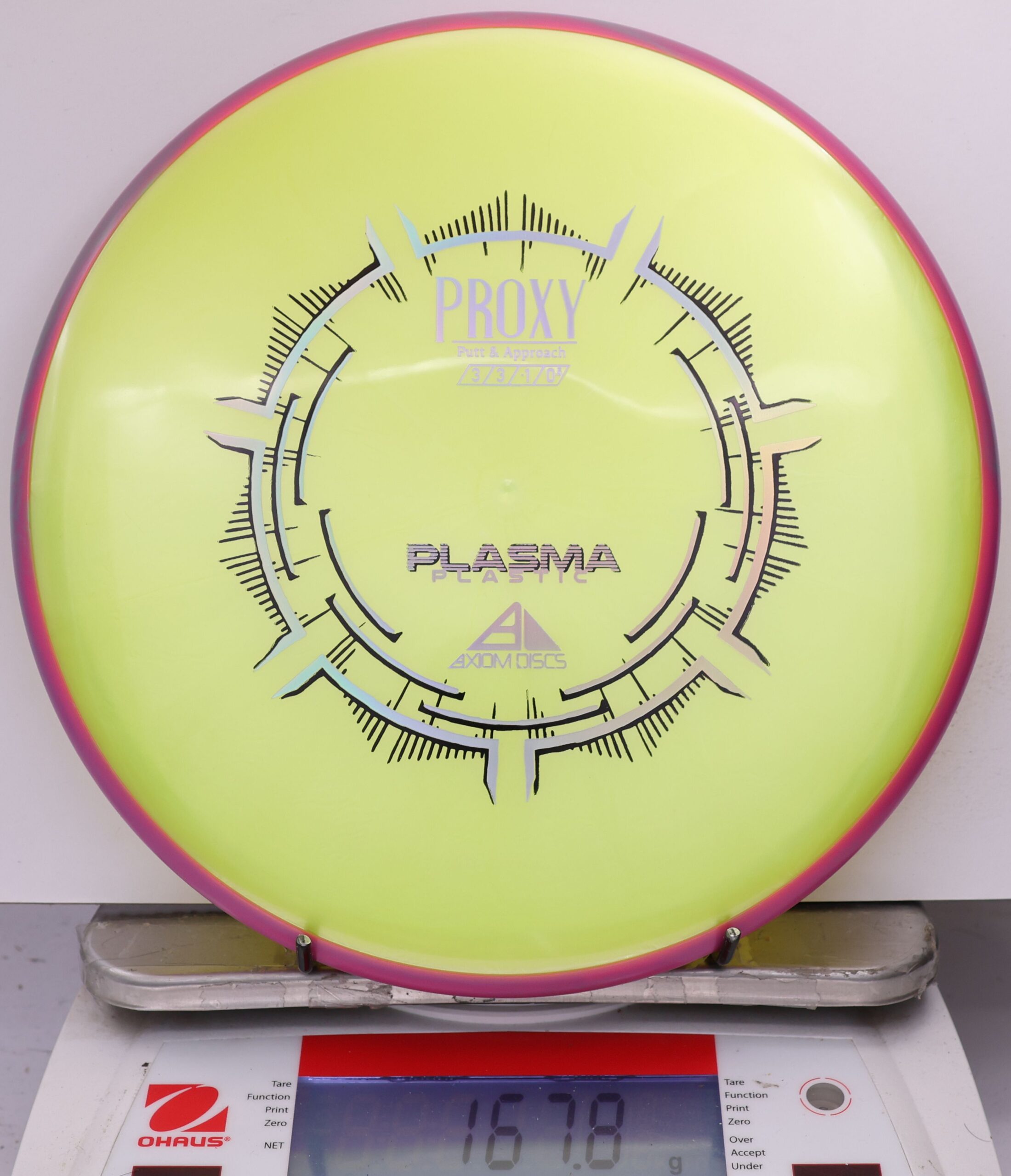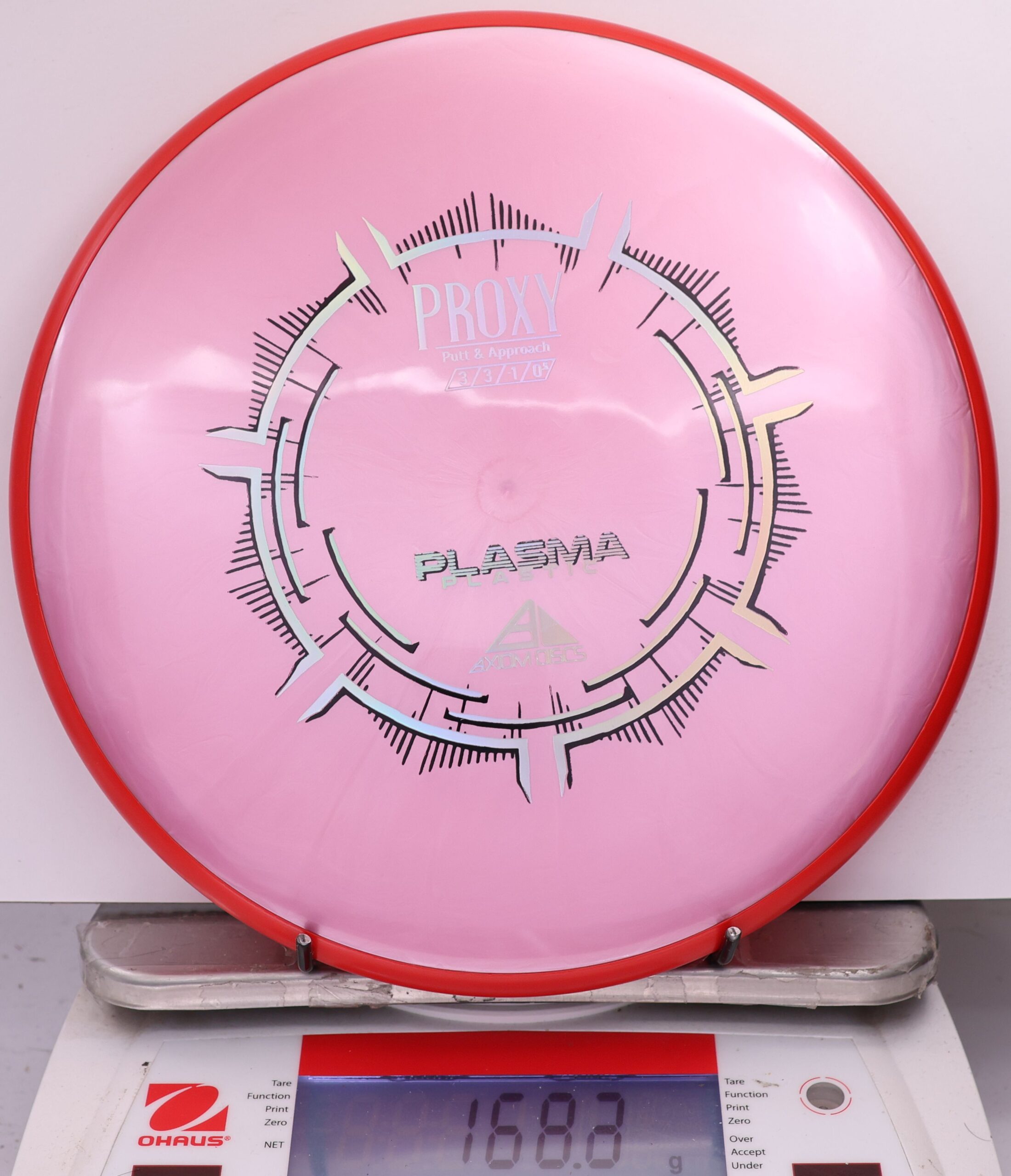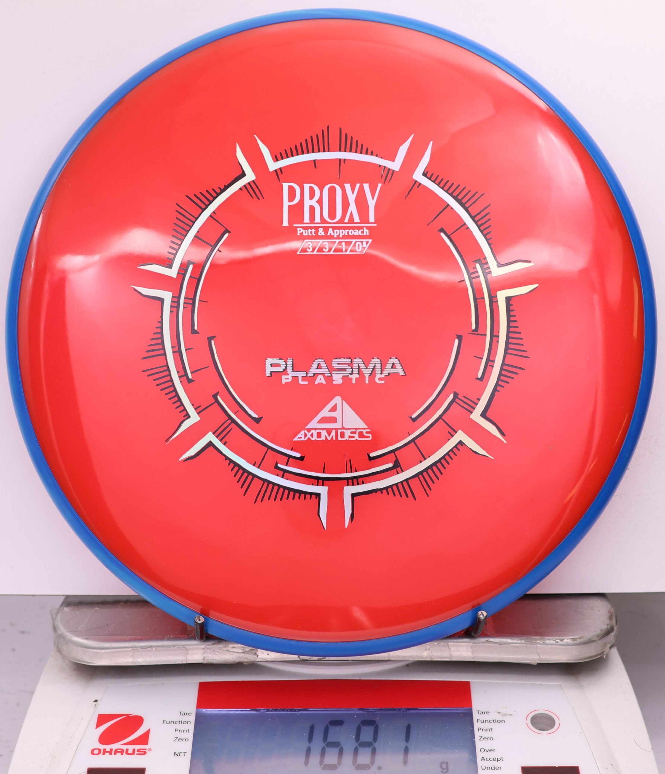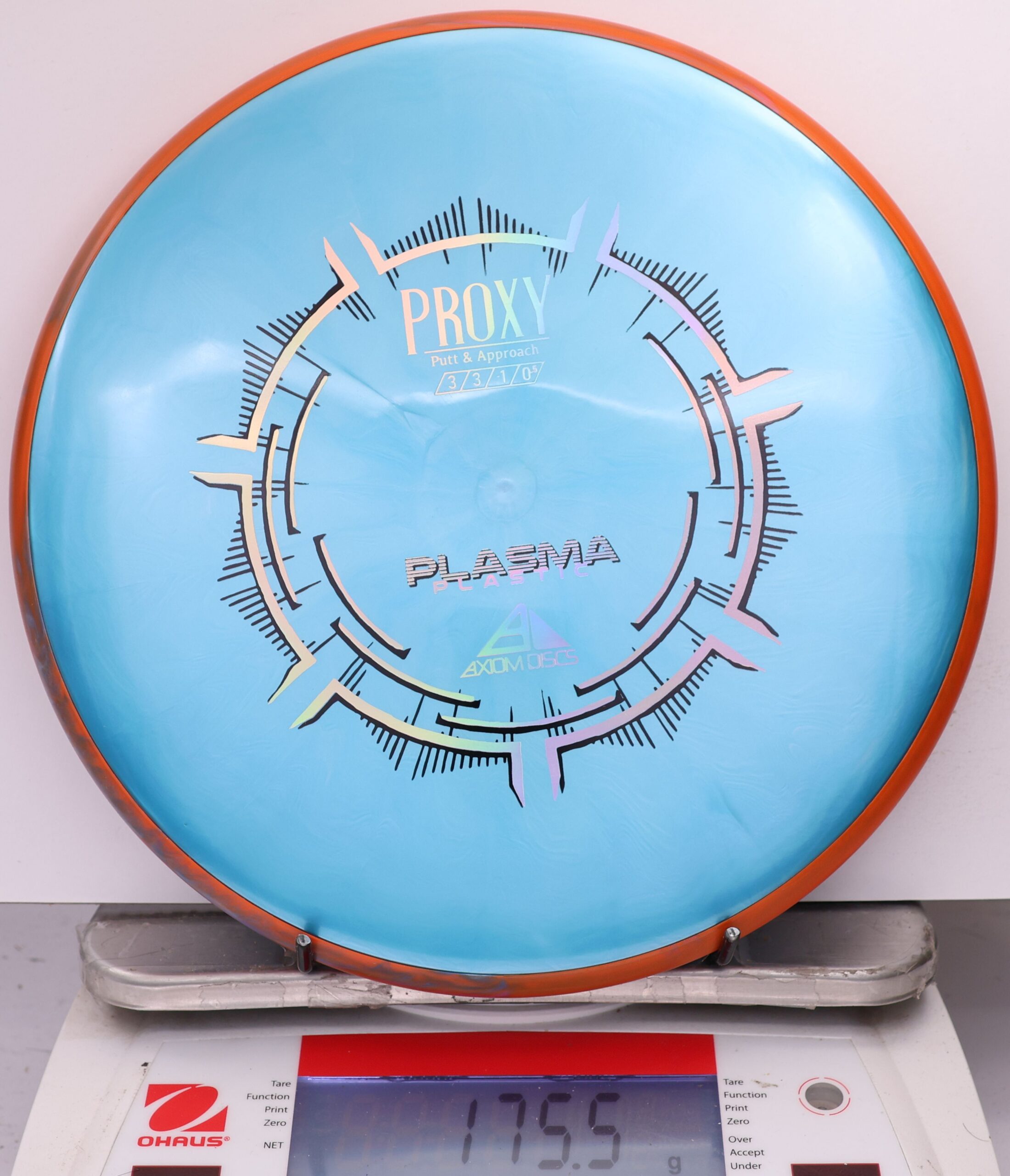 The Axiom Plasma Proxy is a straight-stable putt and approach disc with flight ratings of 3 | 3 | -1 | 0.5. It offers a low-profile feel and solid grip, making it ideal for precise throws and approaches.