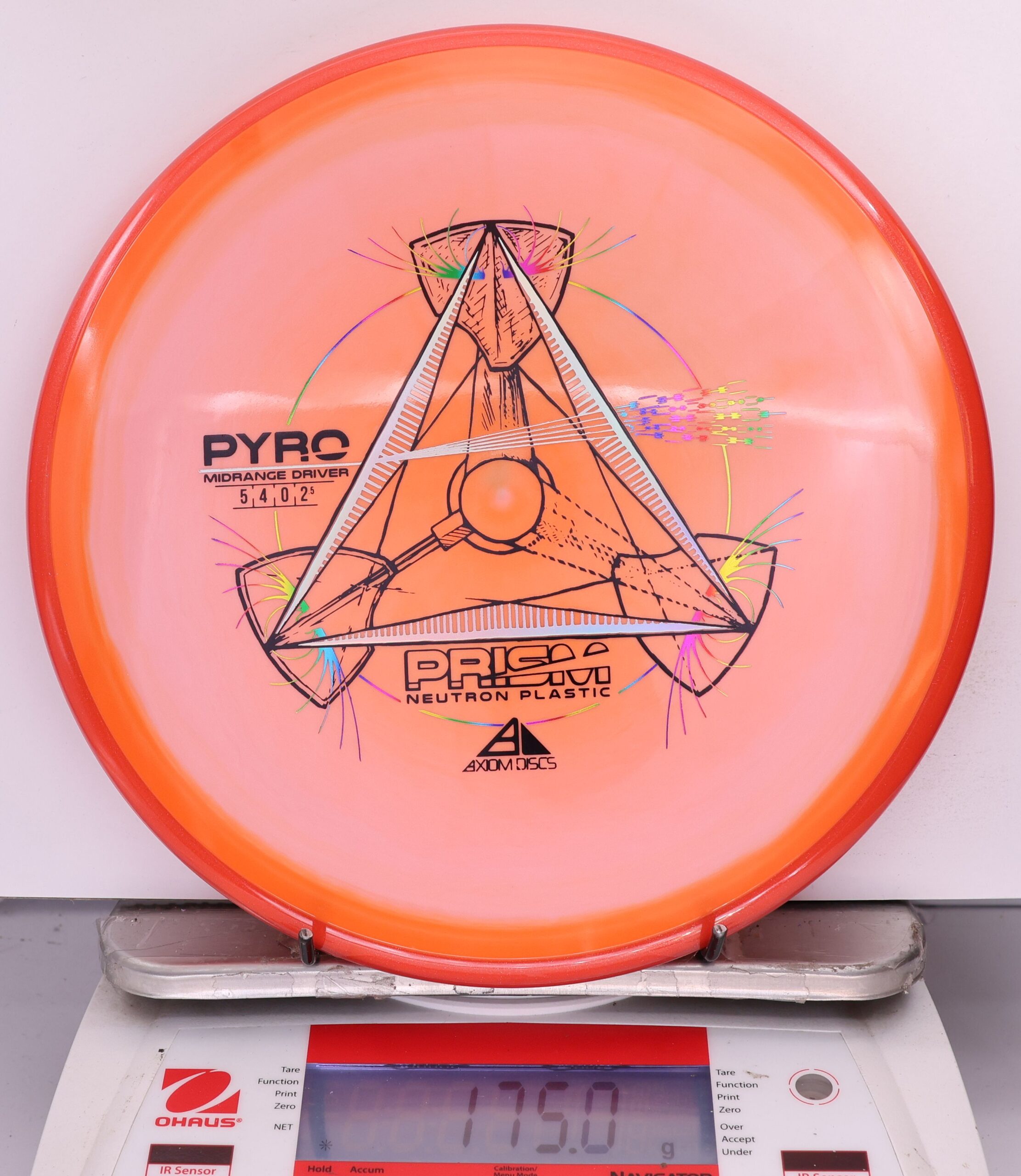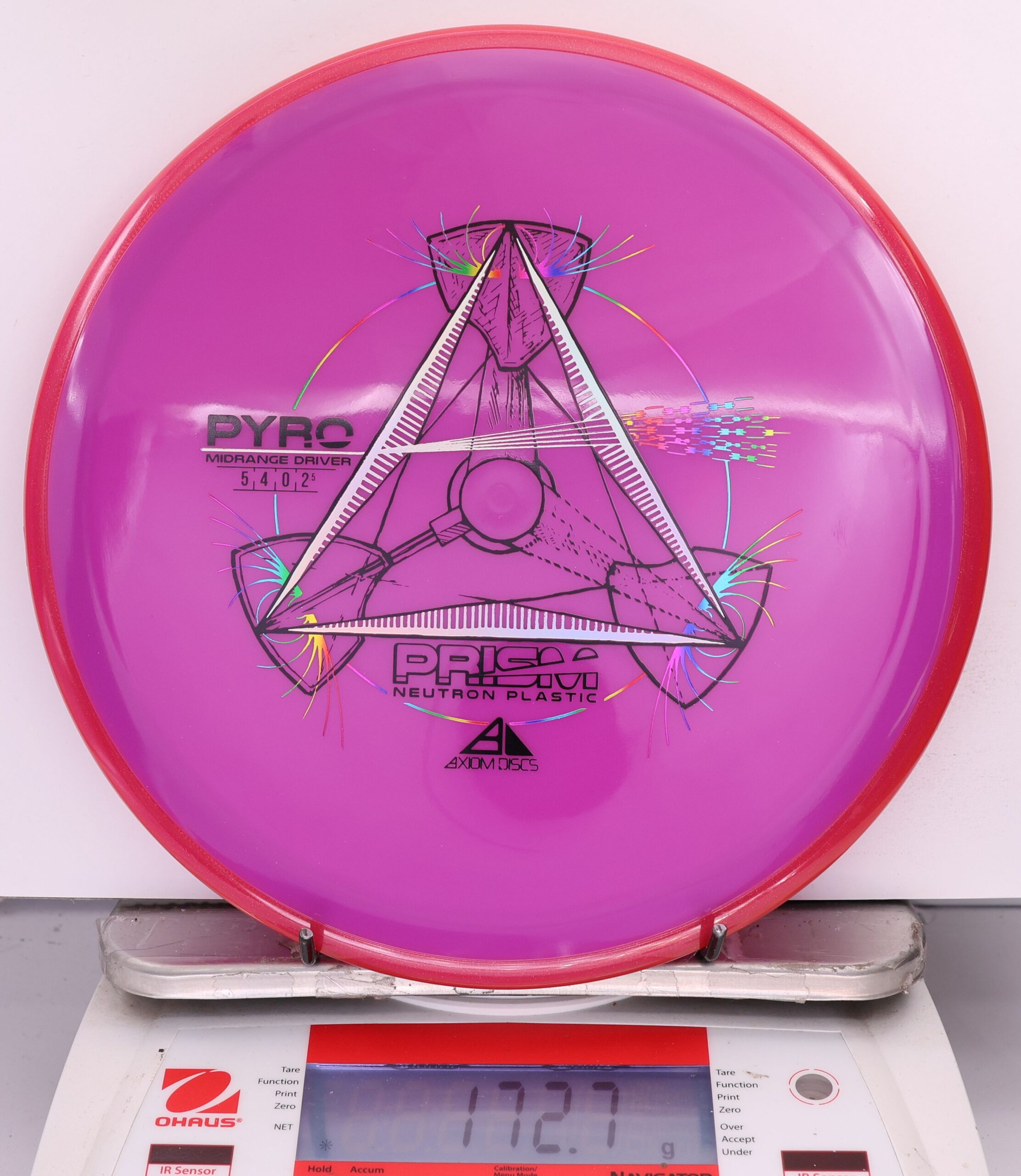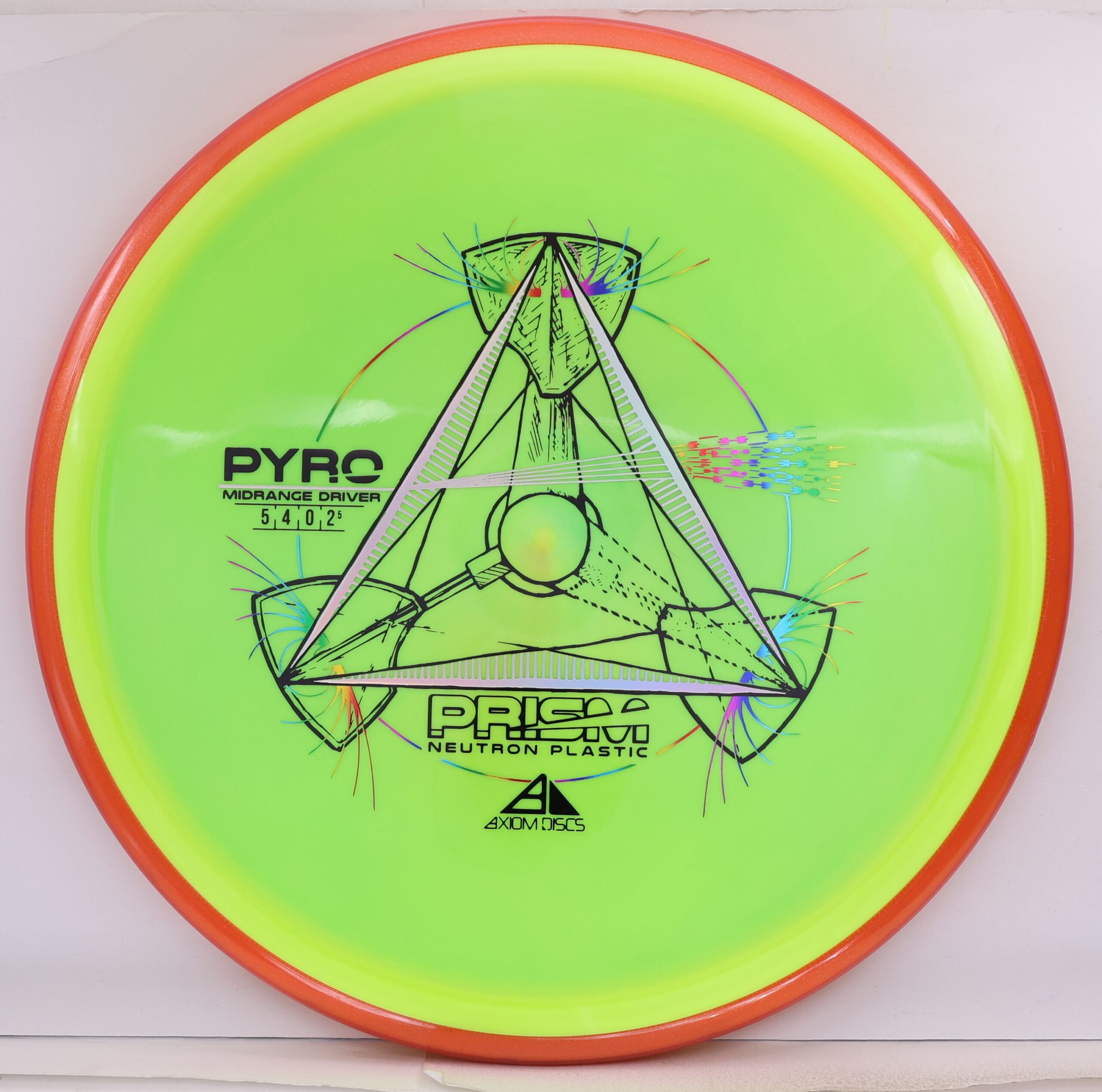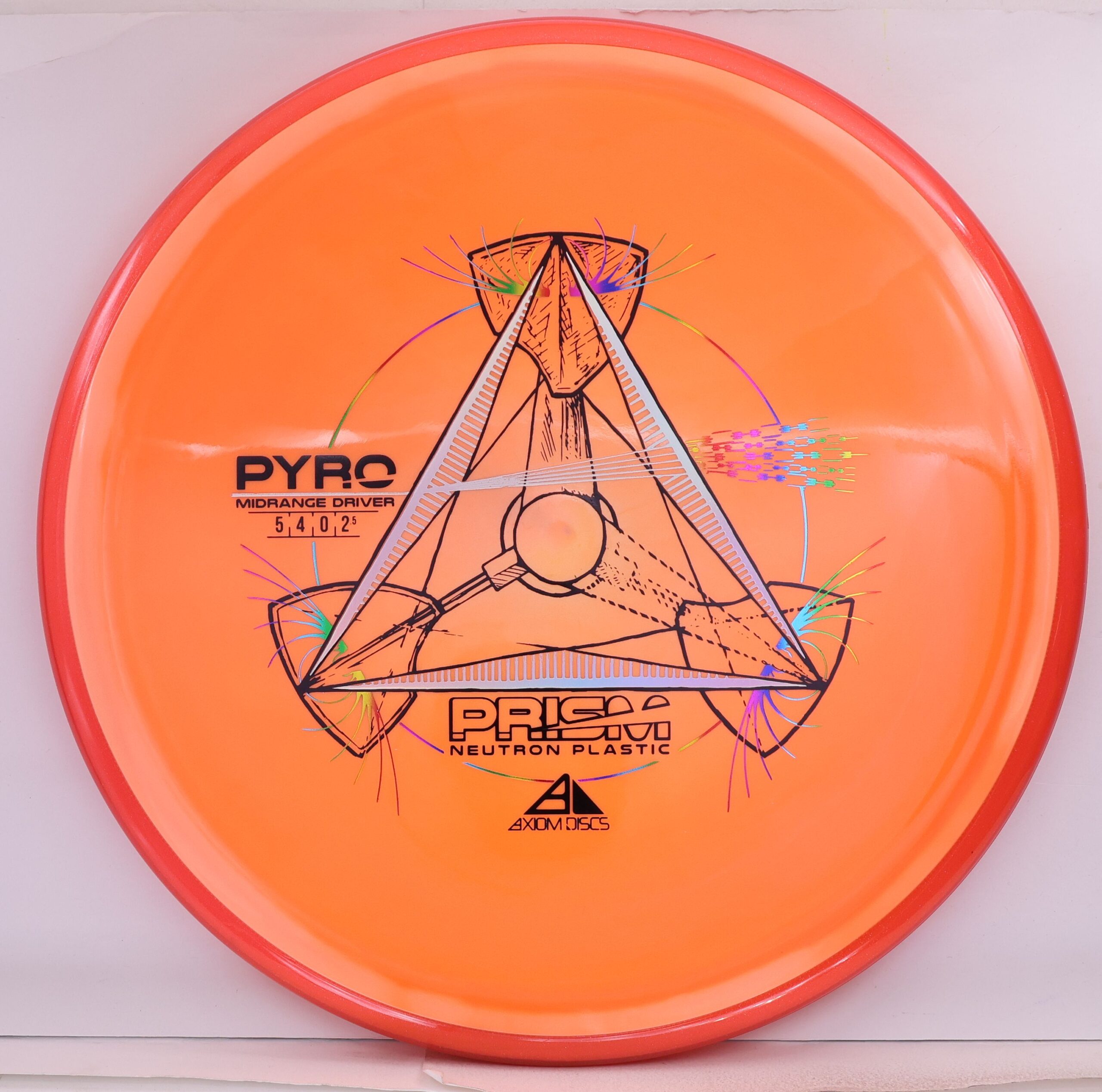 The Axiom Prism Neutron Pyro is a beefy midrange with a flashy, candy-coated rim and serious overstability. It’s made to handle power, fight wind, and end with a reliable fade—perfect for forehands, flex lines, and confident, controlled approaches.