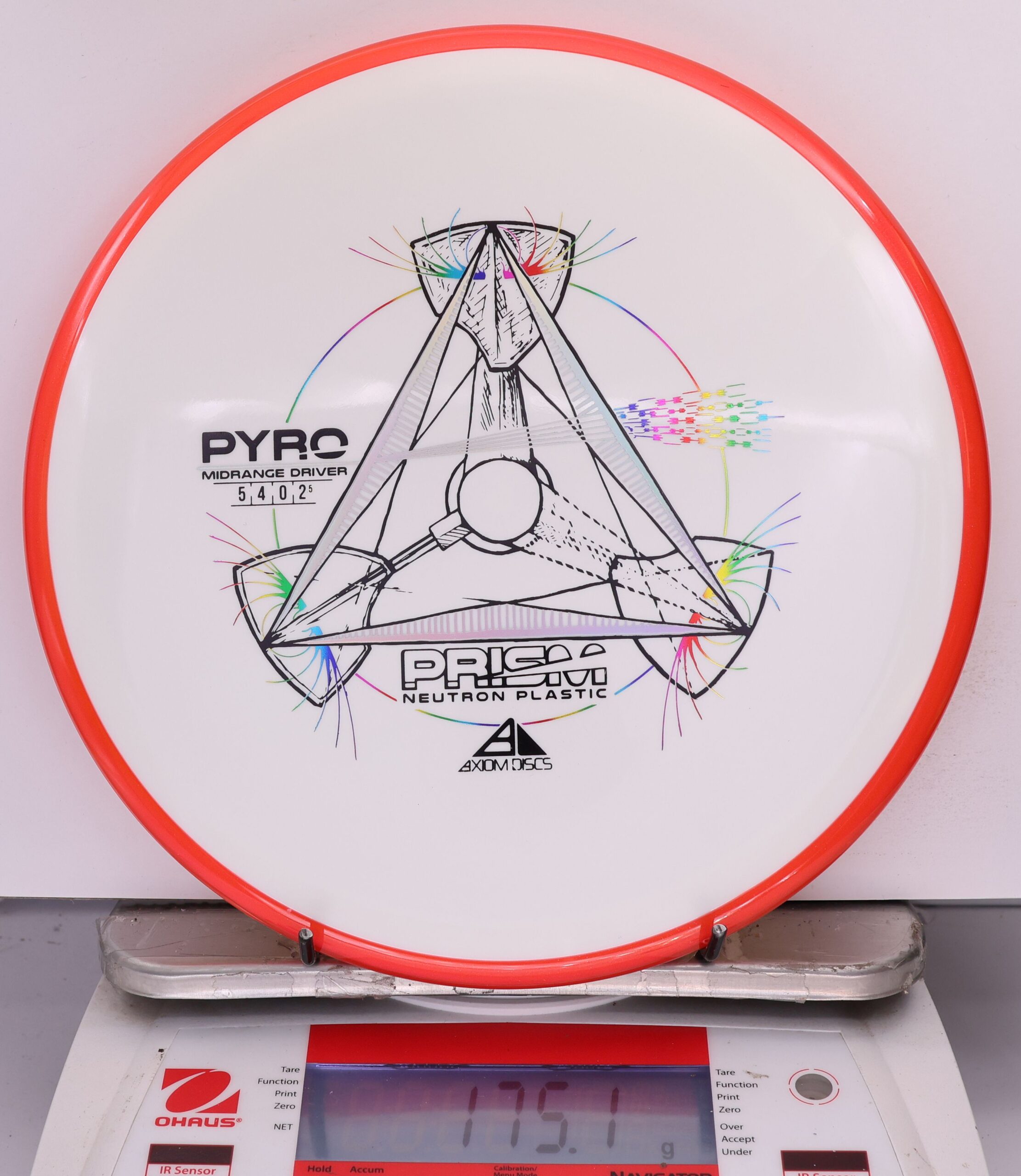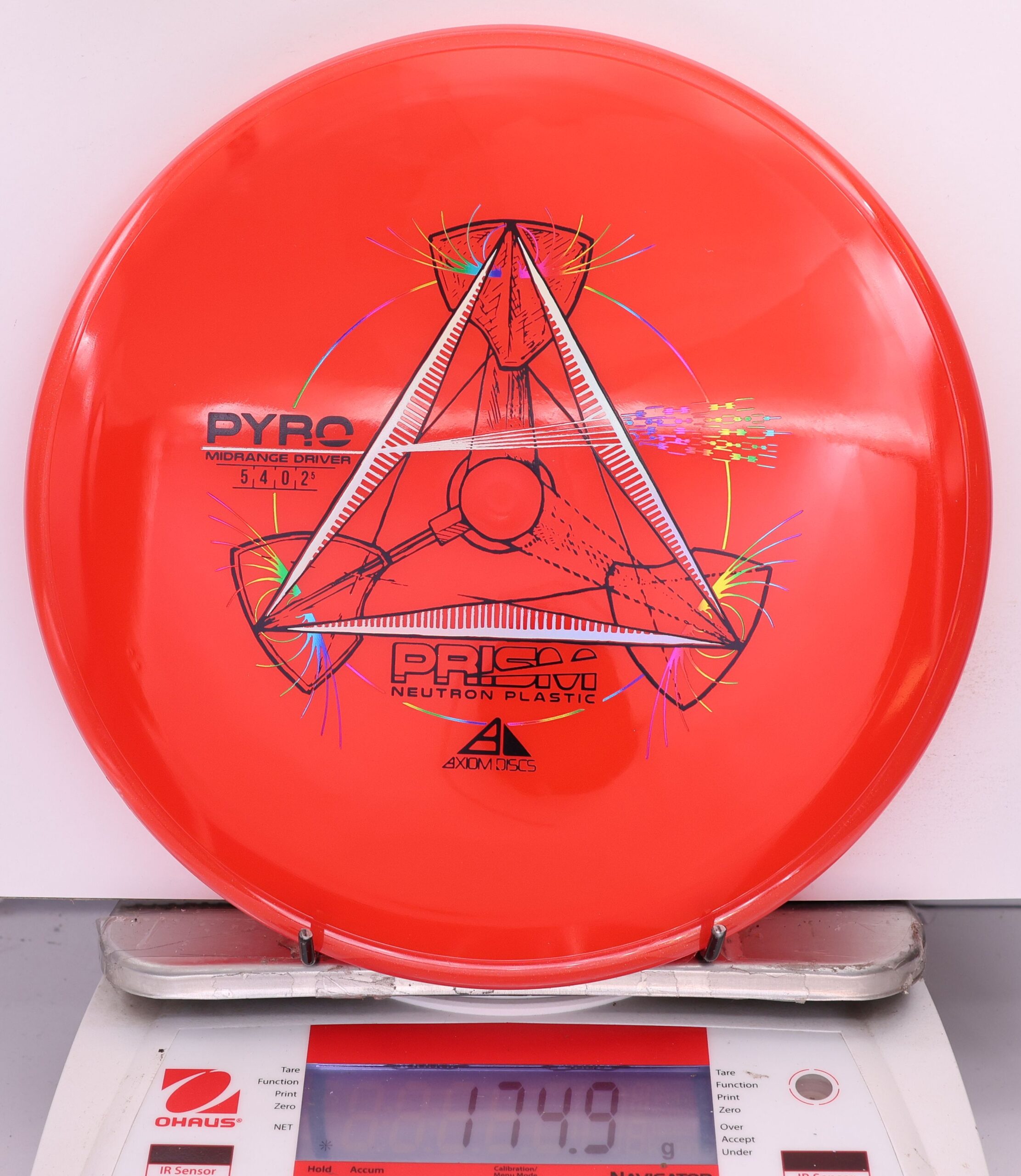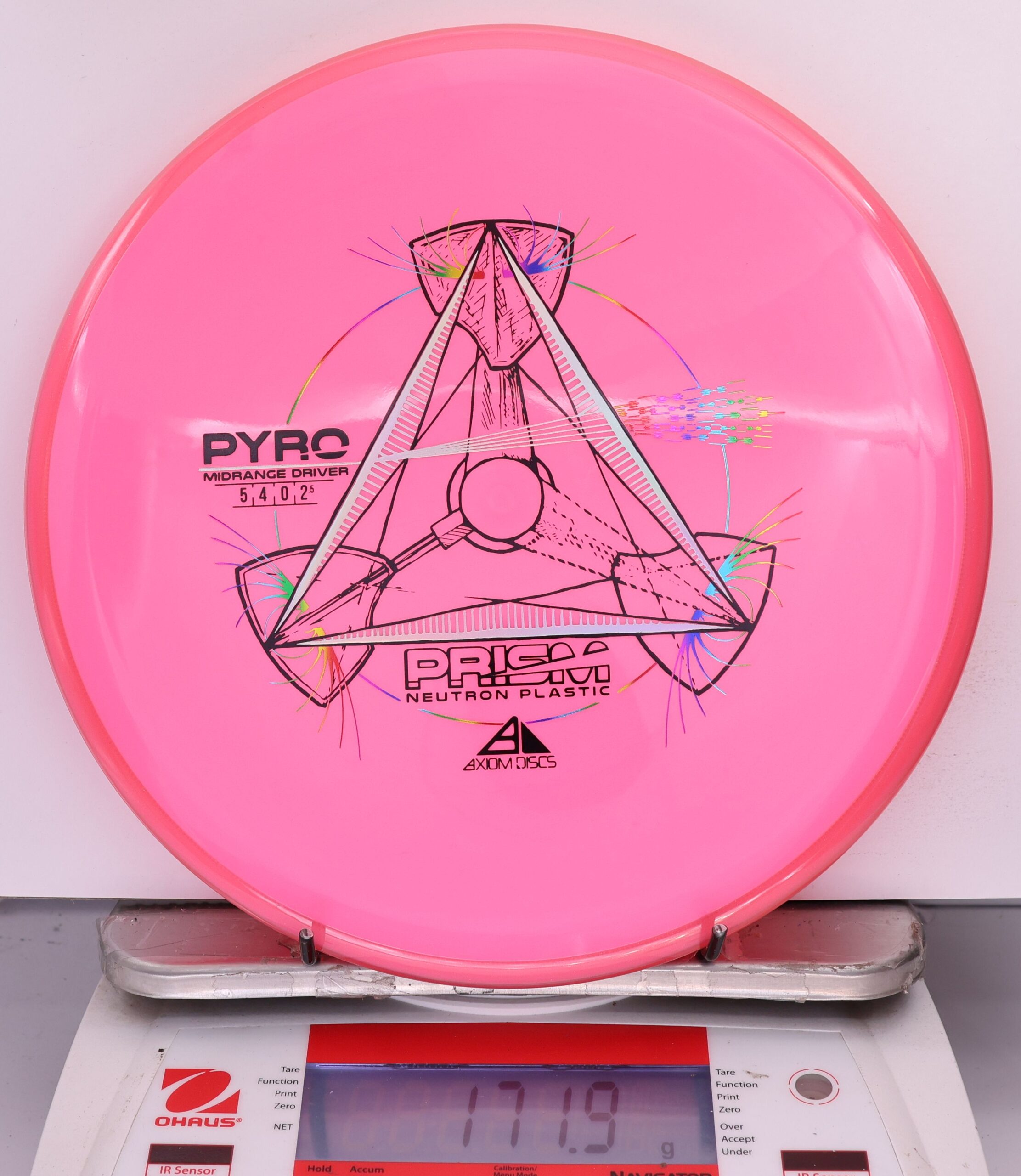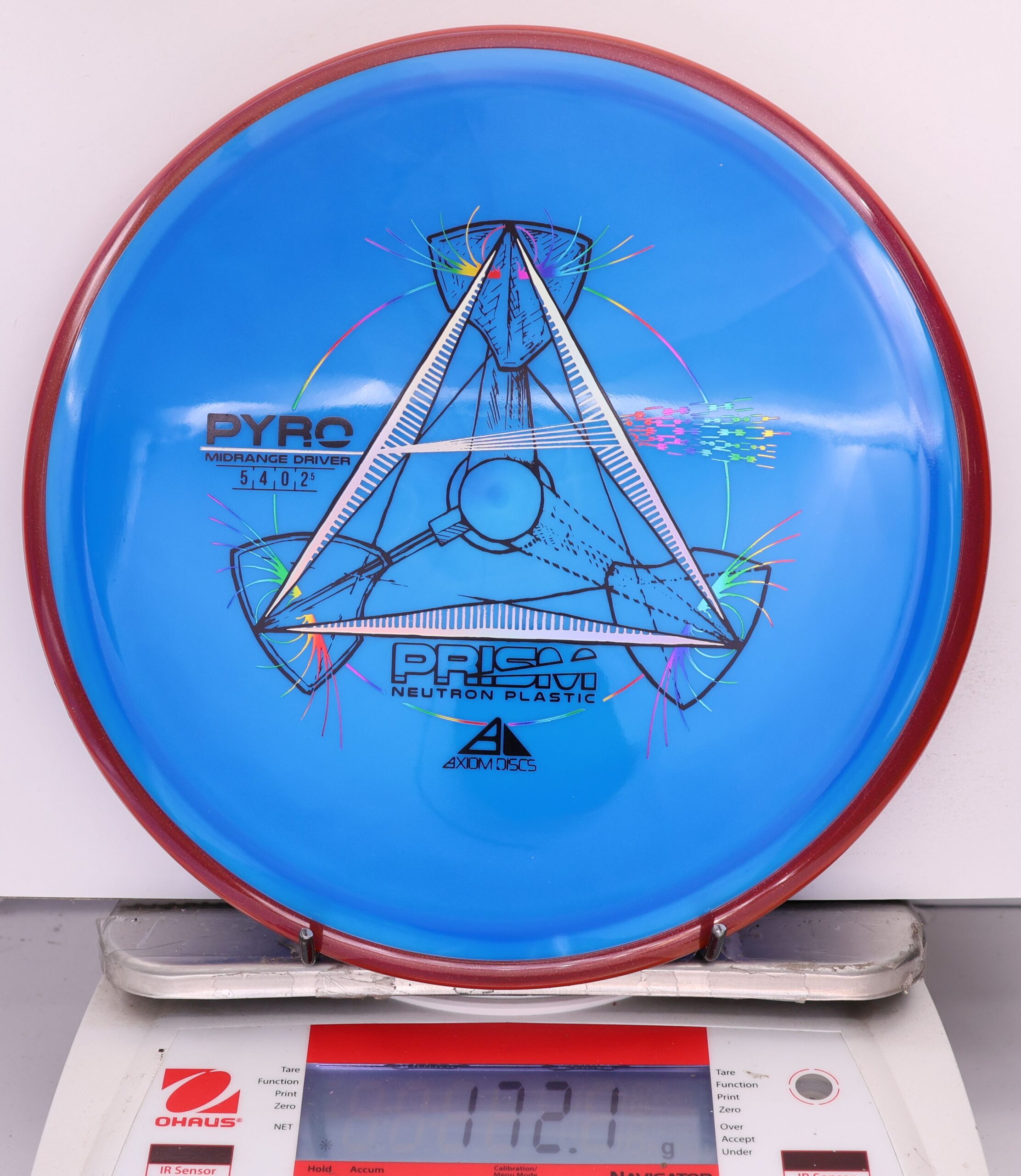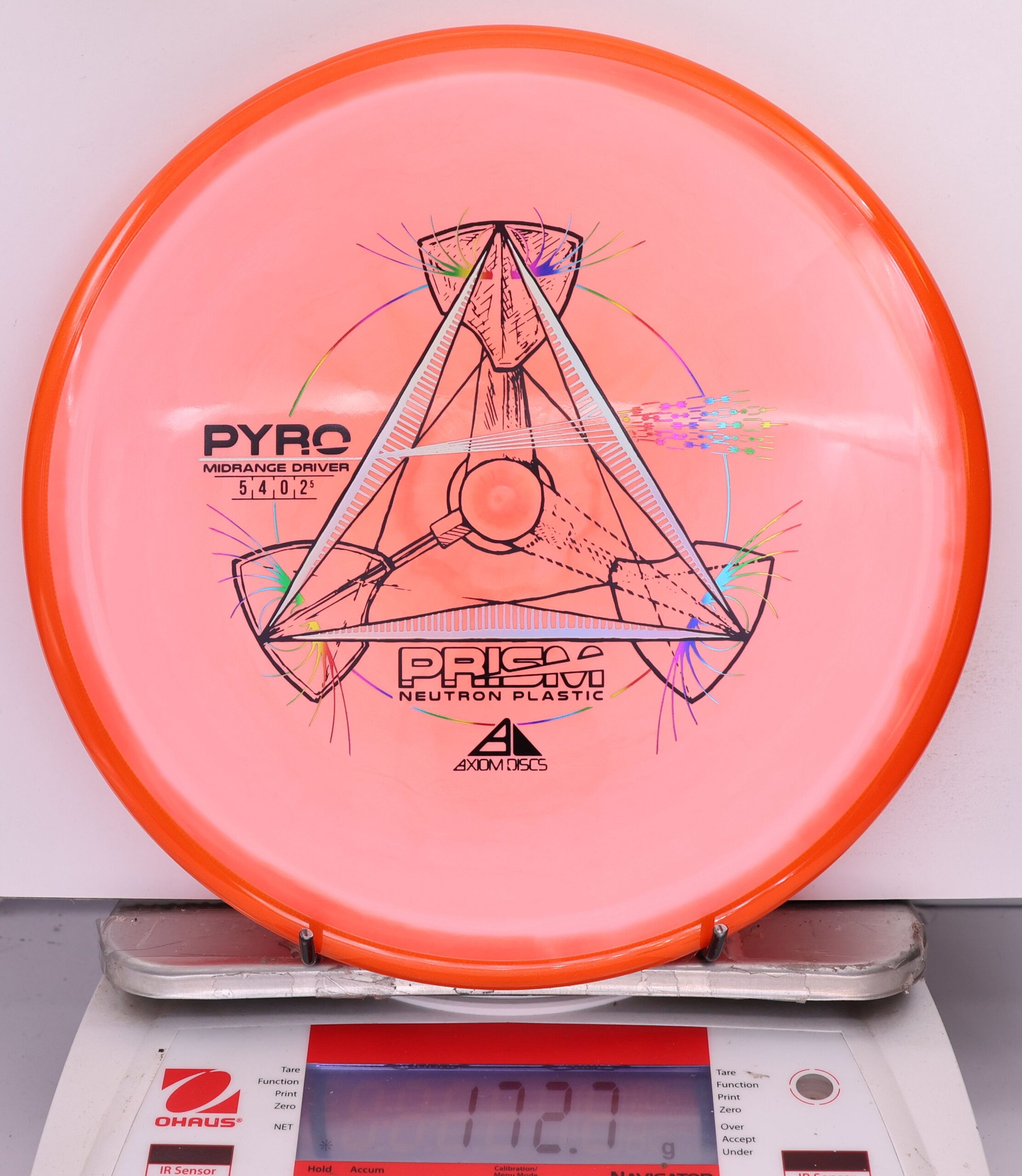 The Axiom Prism Neutron Pyro is a beefy midrange with a flashy, candy-coated rim and serious overstability. It’s made to handle power, fight wind, and end with a reliable fade—perfect for forehands, flex lines, and confident, controlled approaches.