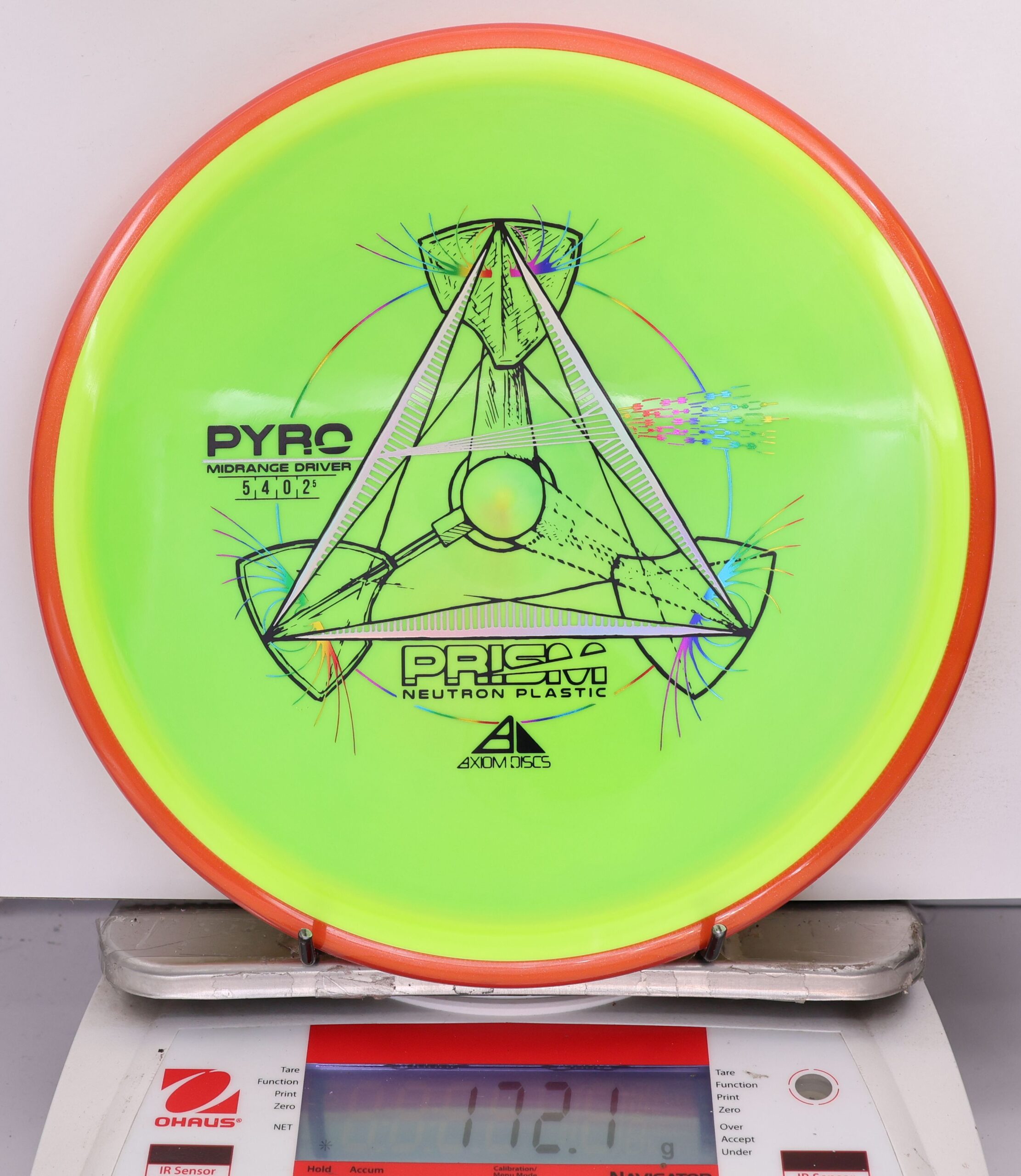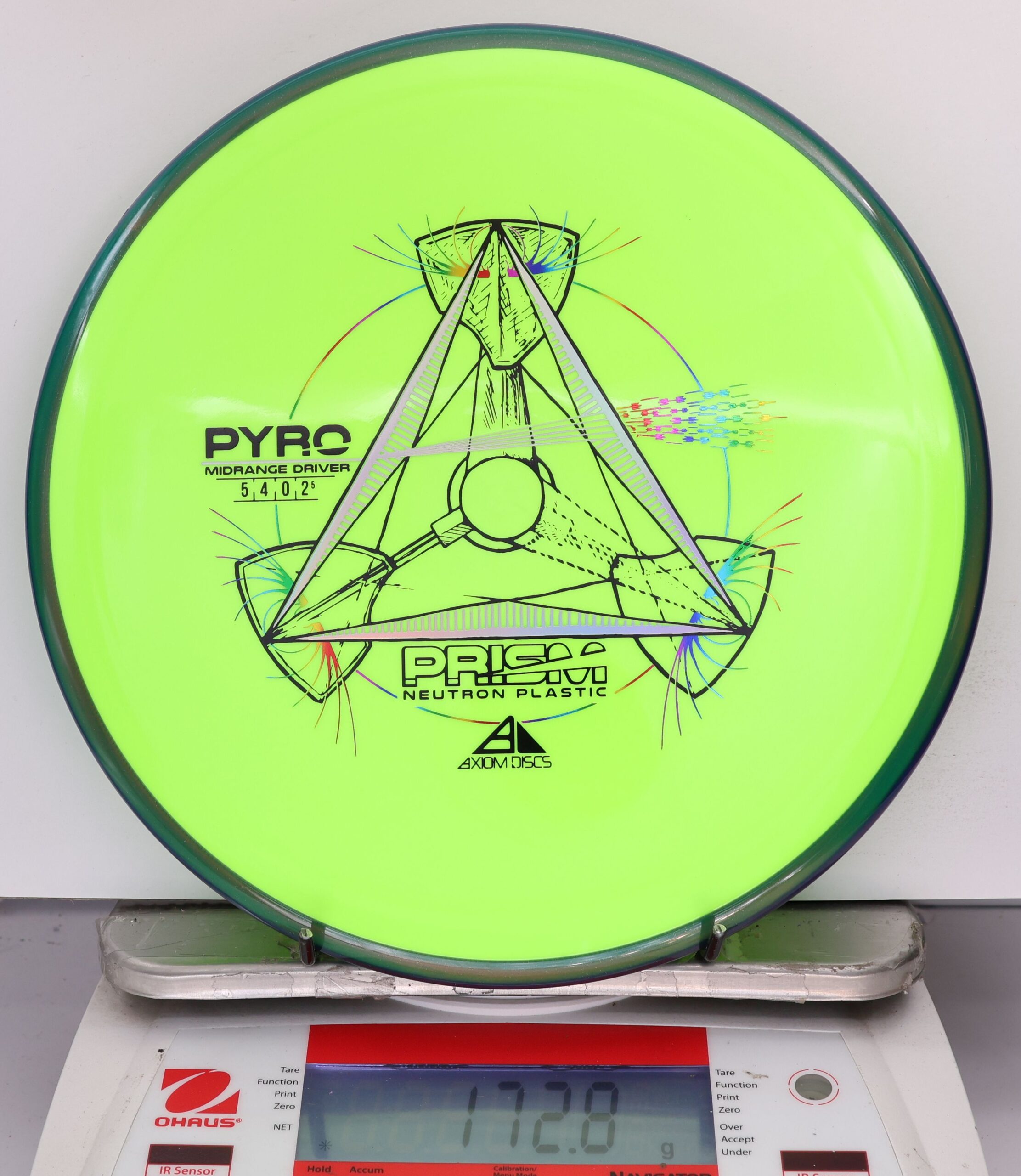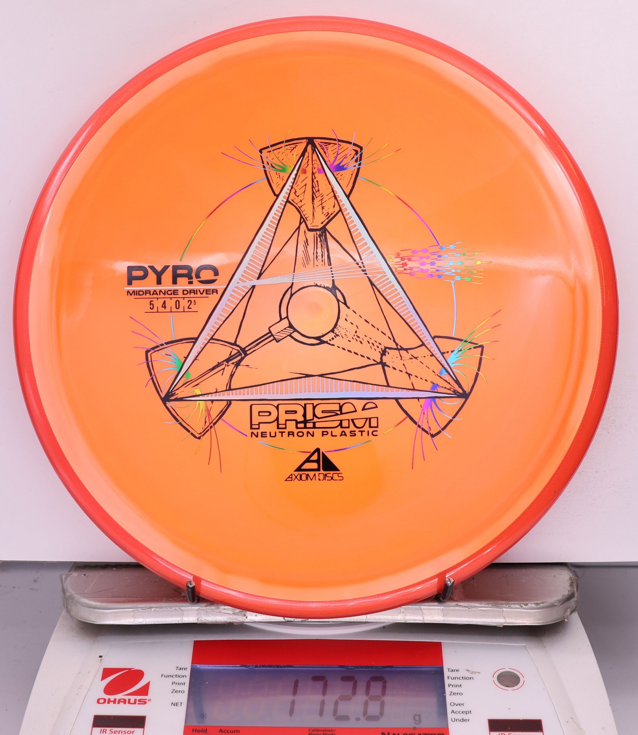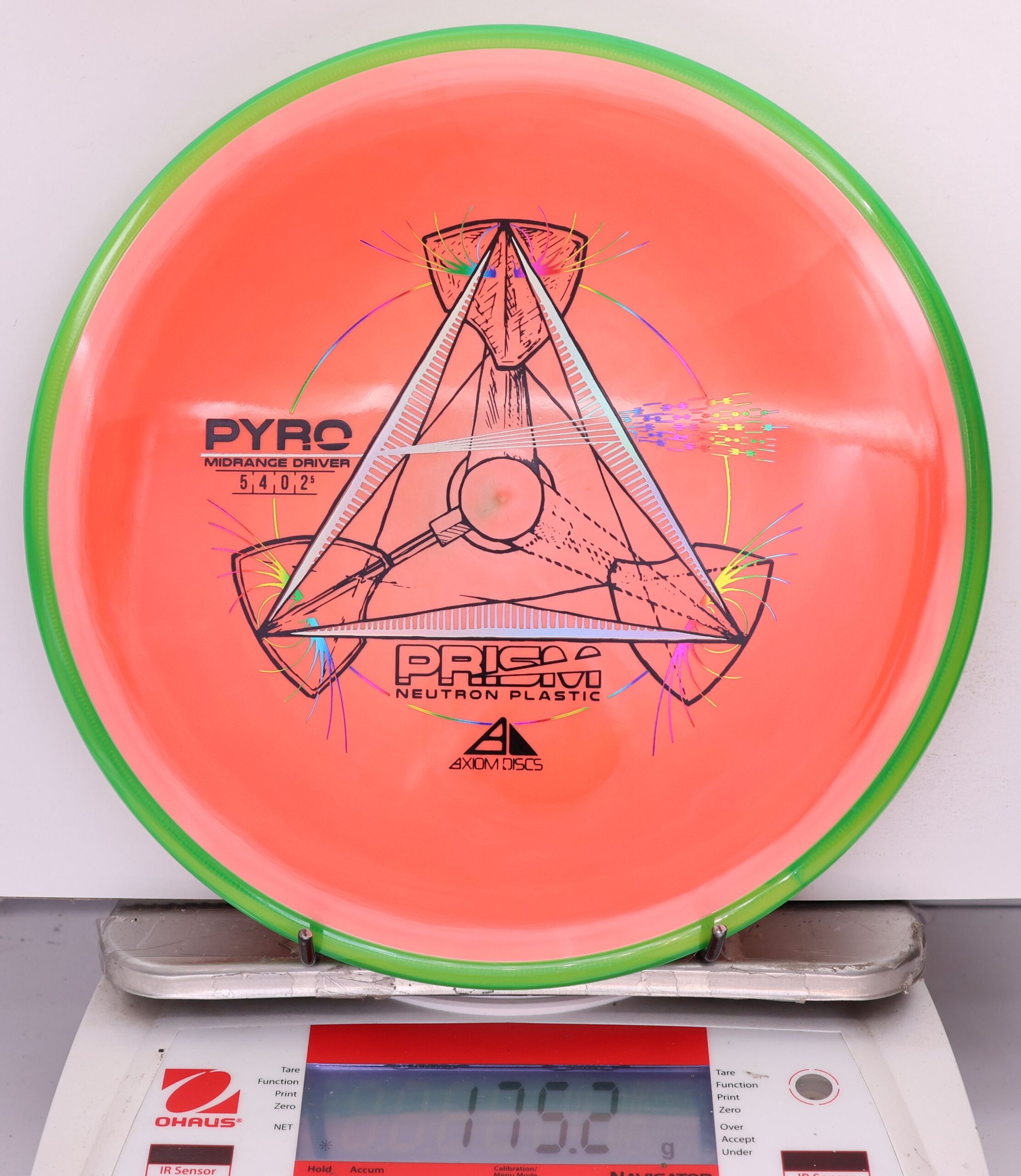 The Axiom Prism Neutron Pyro is a beefy midrange with a flashy, candy-coated rim and serious overstability. It’s made to handle power, fight wind, and end with a reliable fade—perfect for forehands, flex lines, and confident, controlled approaches.