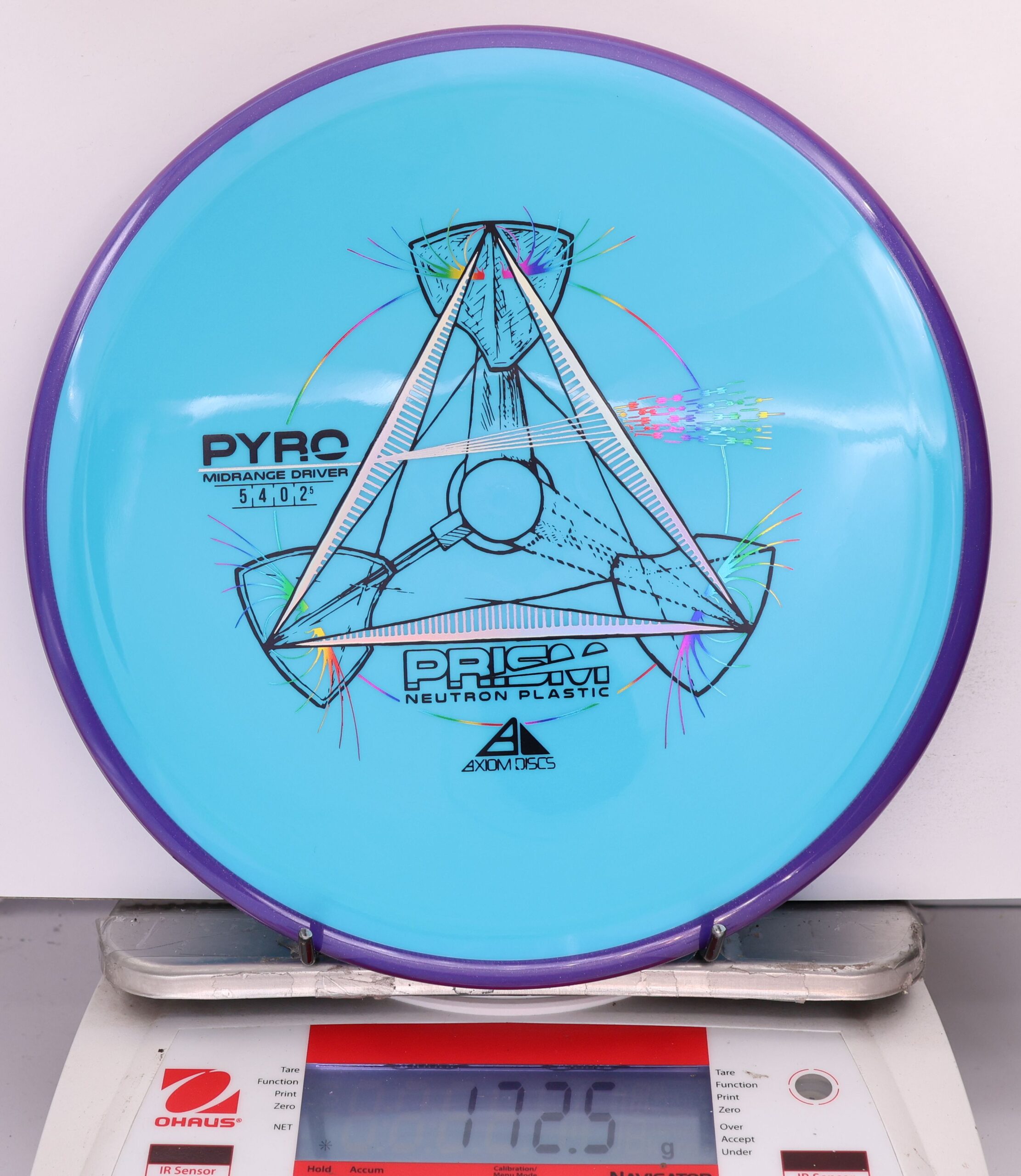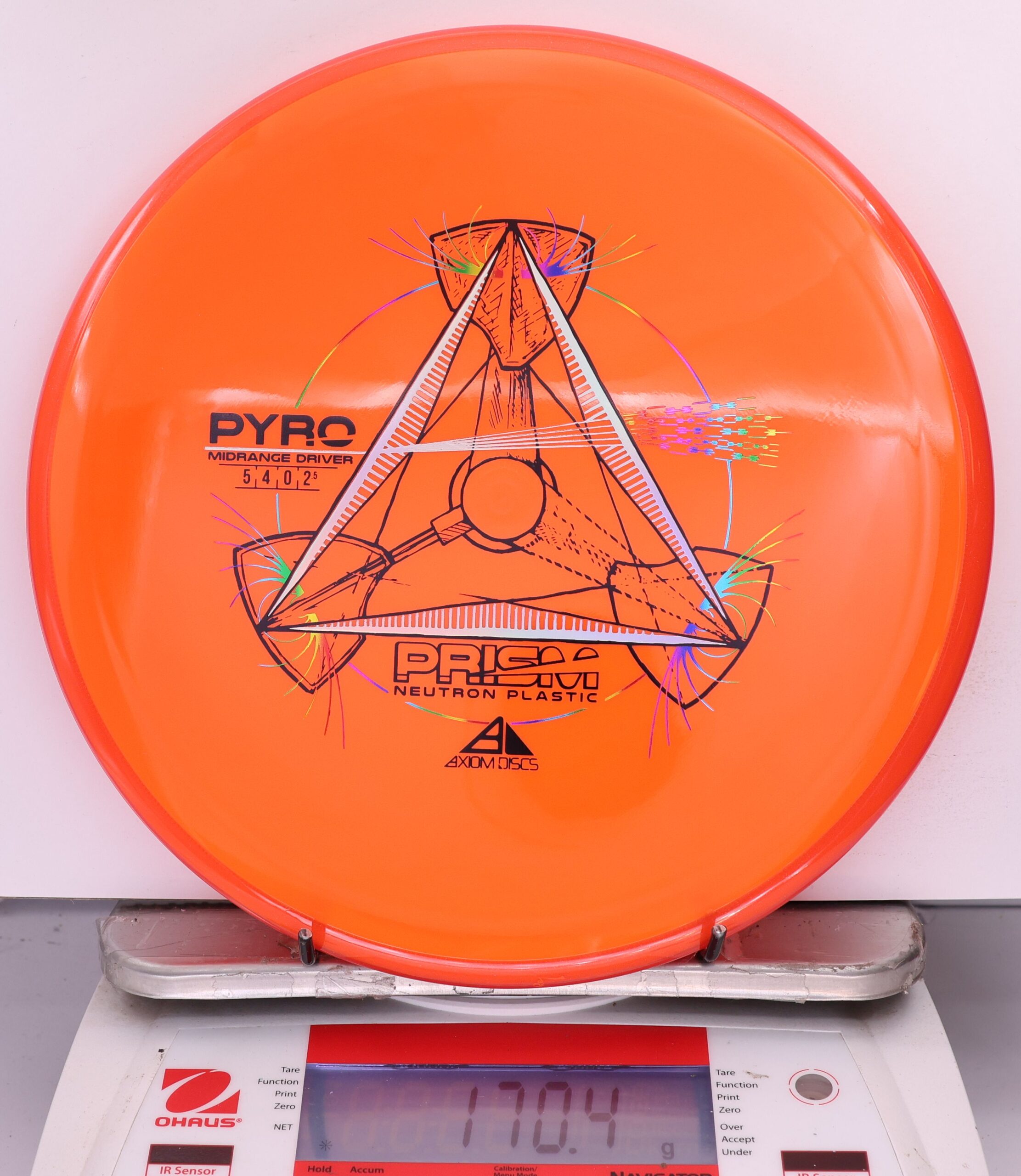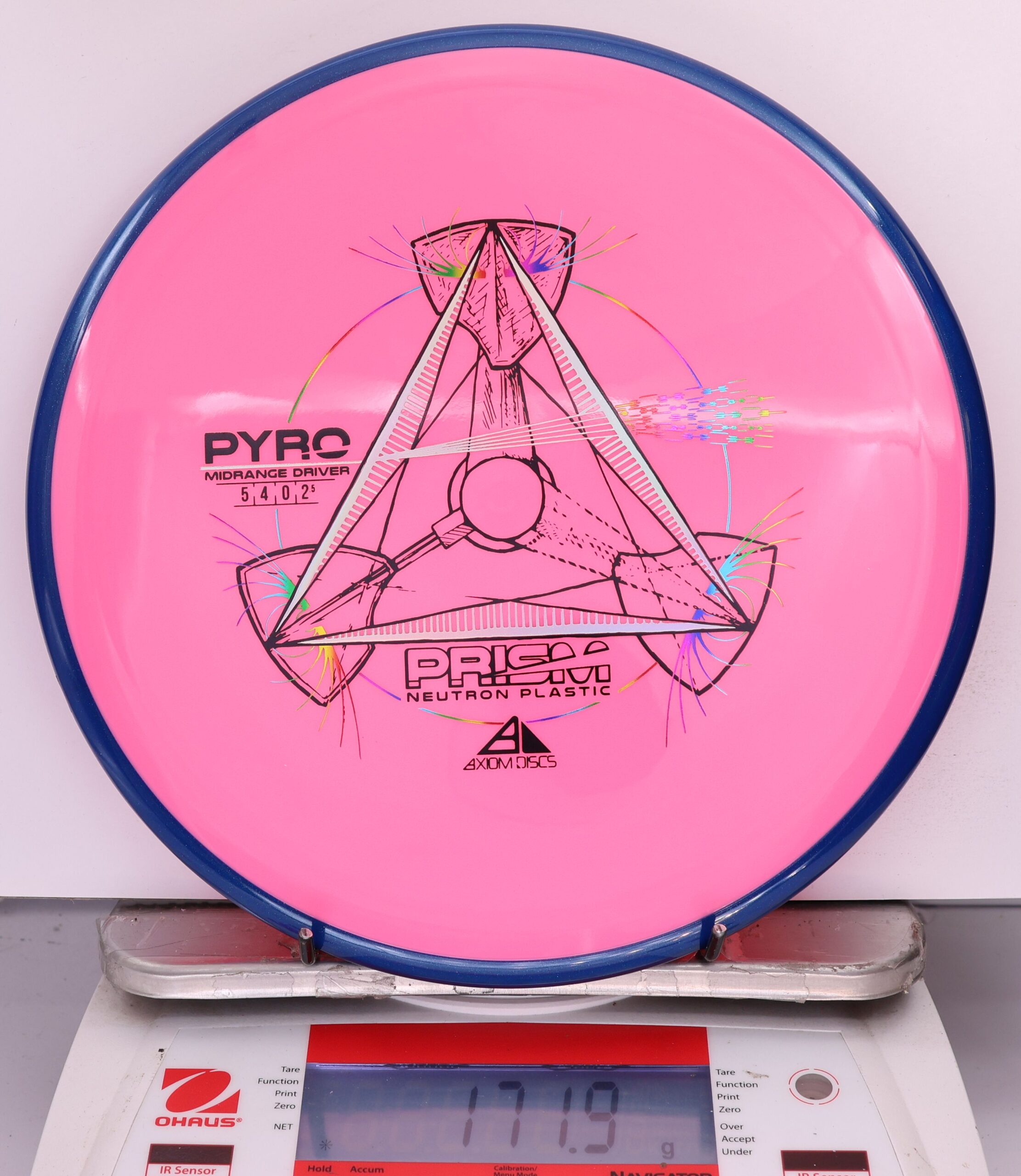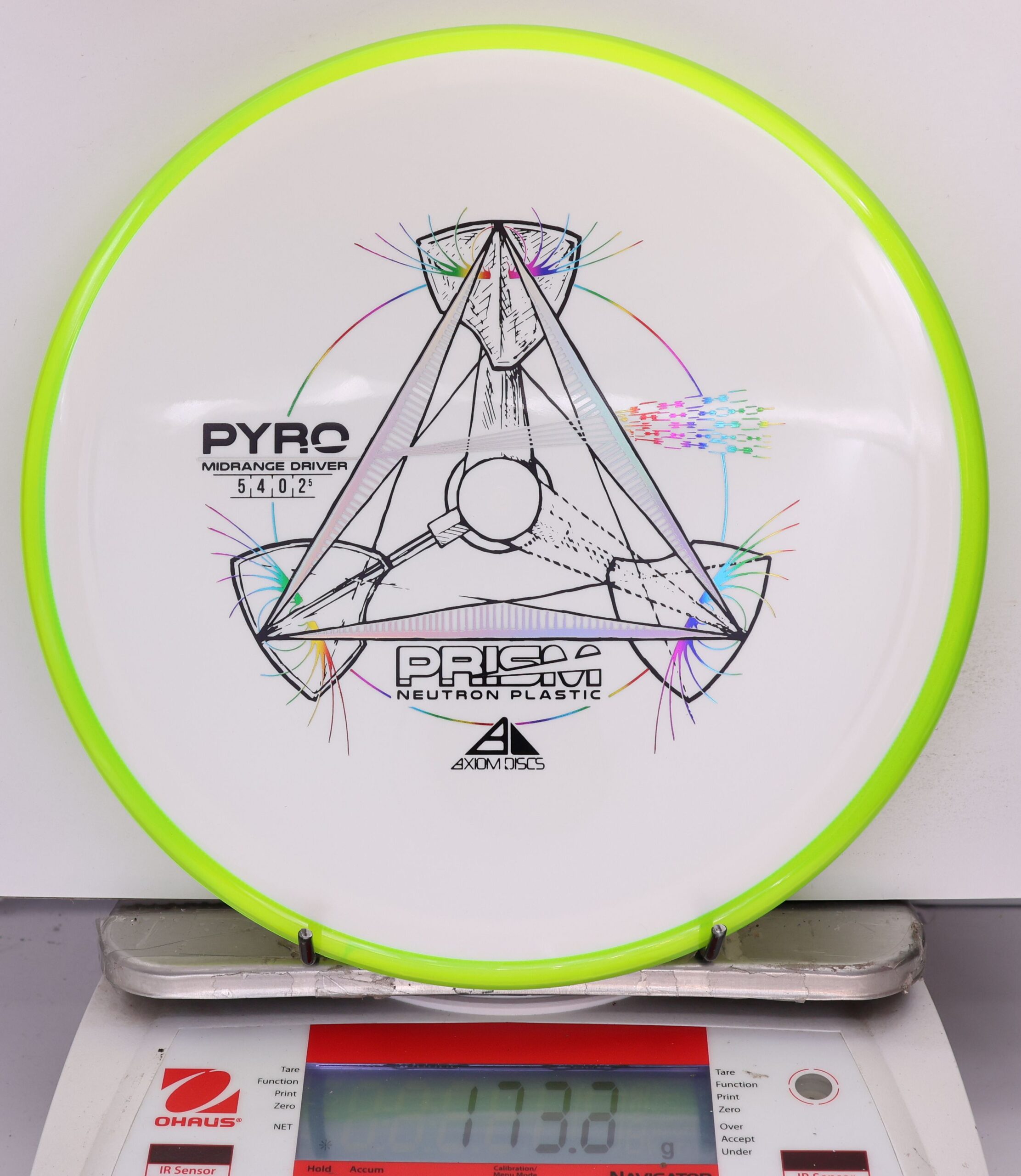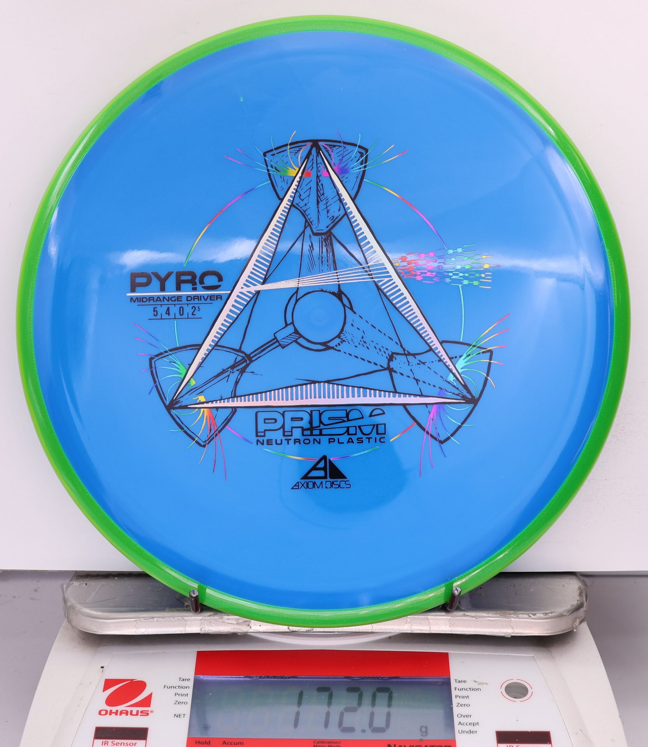 The Axiom Prism Neutron Pyro is a beefy midrange with a flashy, candy-coated rim and serious overstability. It’s made to handle power, fight wind, and end with a reliable fade—perfect for forehands, flex lines, and confident, controlled approaches.