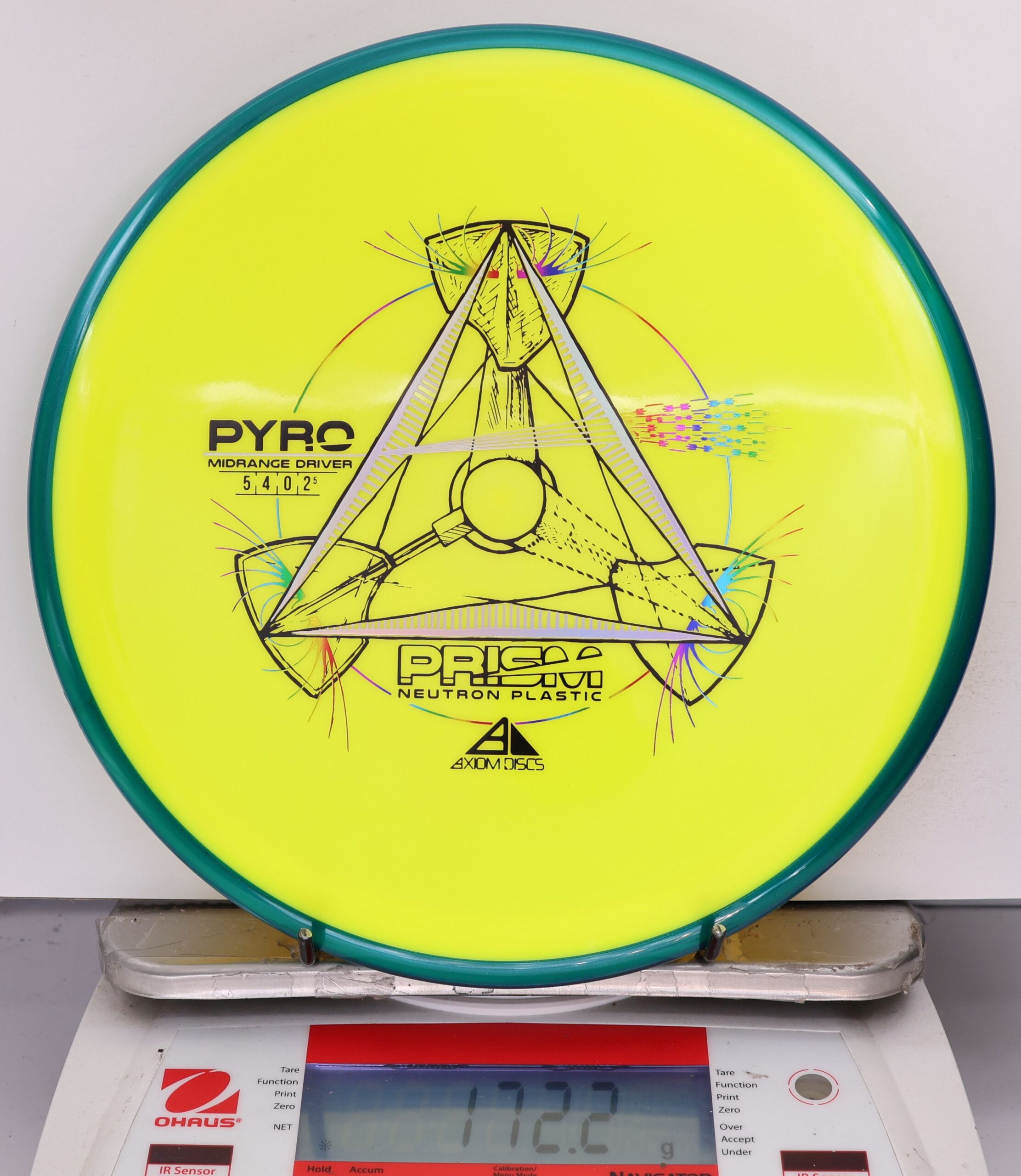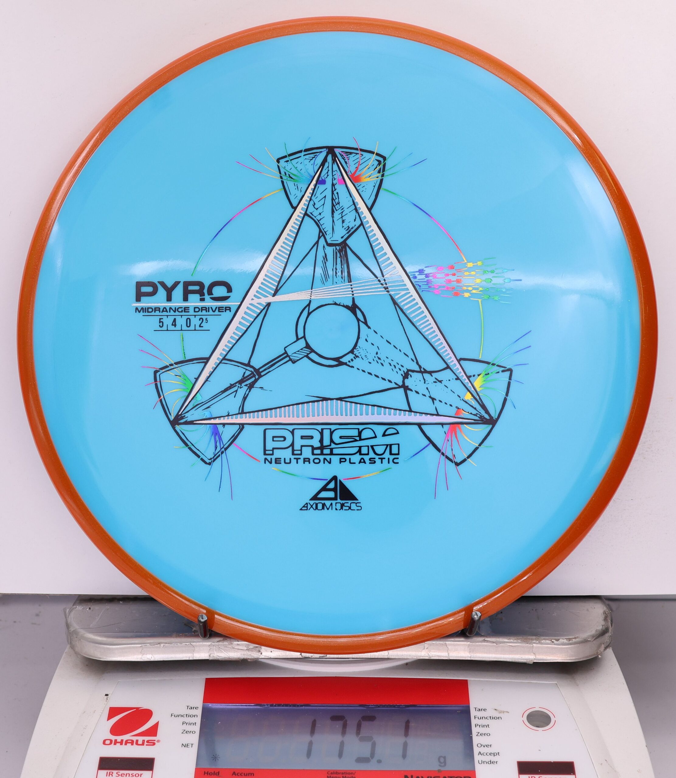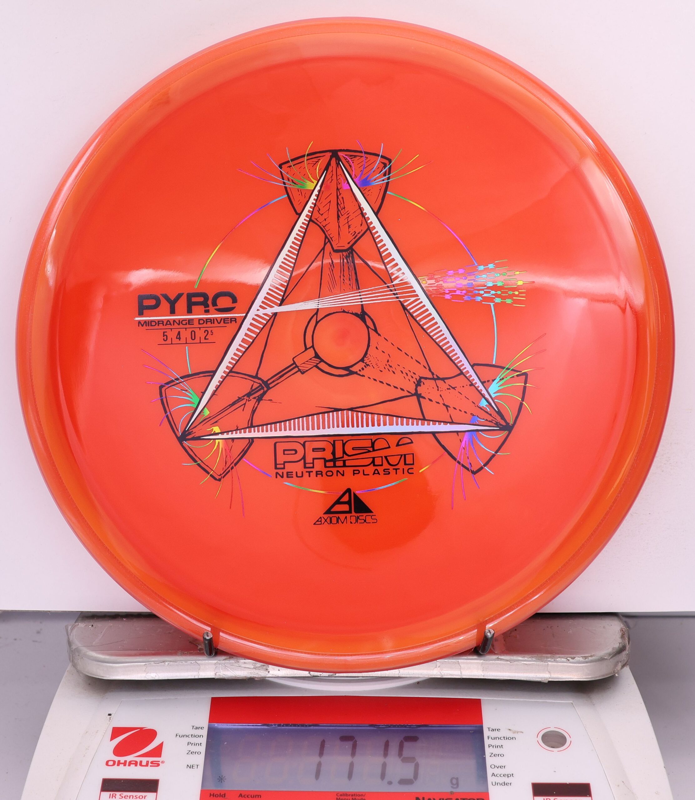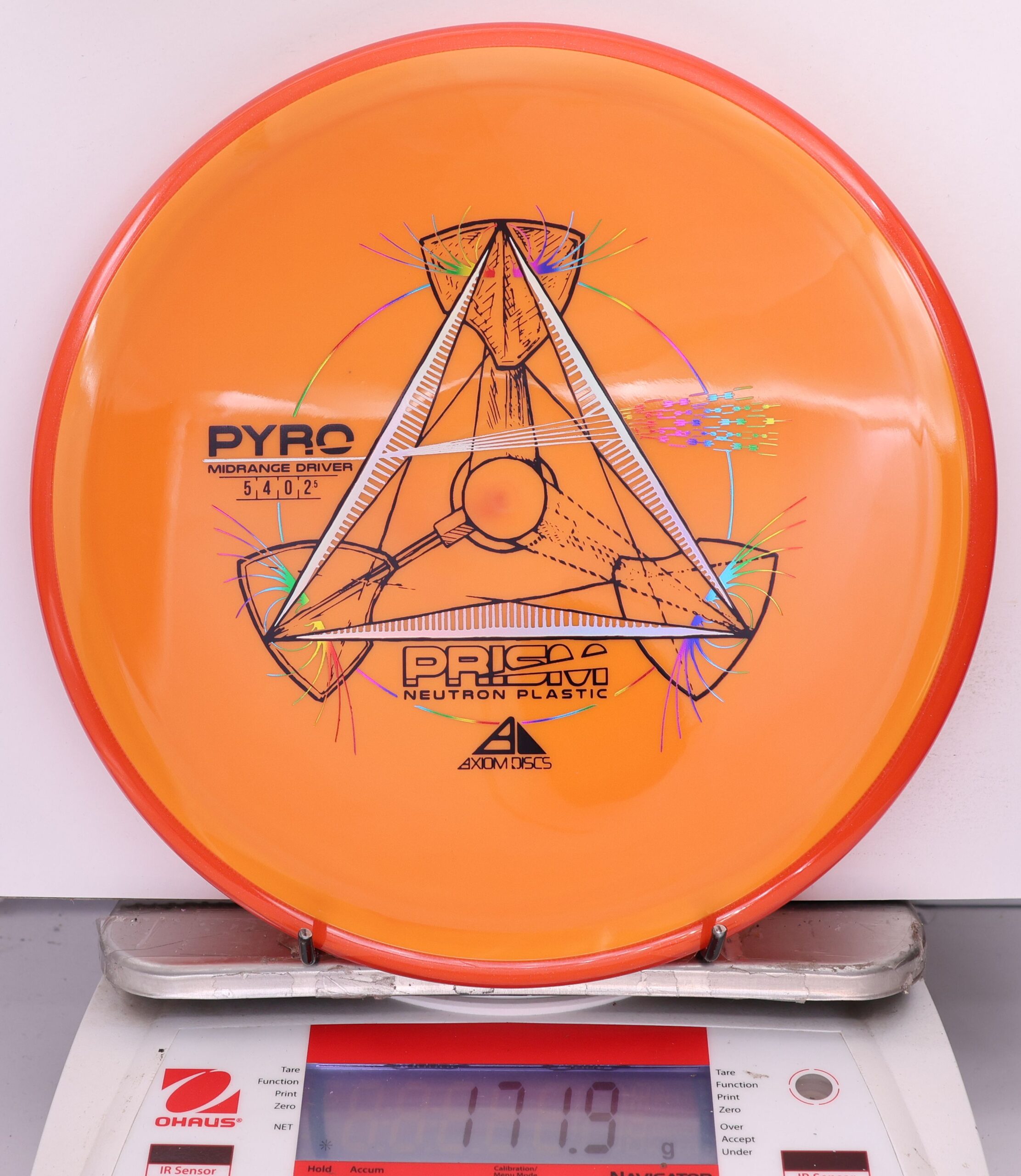 The Axiom Prism Neutron Pyro is a beefy midrange with a flashy, candy-coated rim and serious overstability. It’s made to handle power, fight wind, and end with a reliable fade—perfect for forehands, flex lines, and confident, controlled approaches.