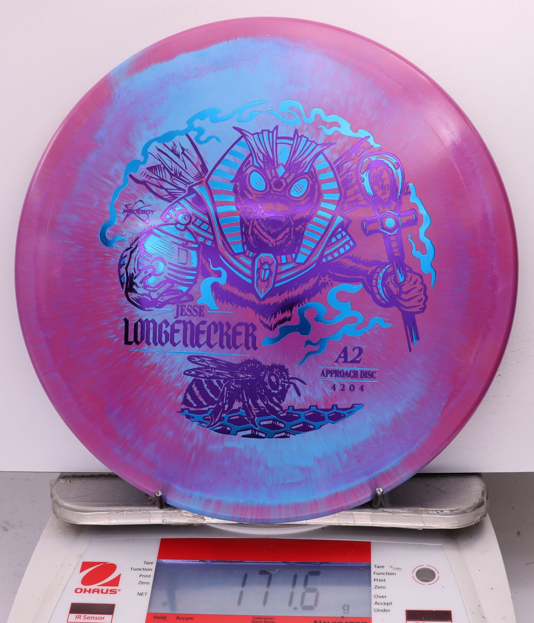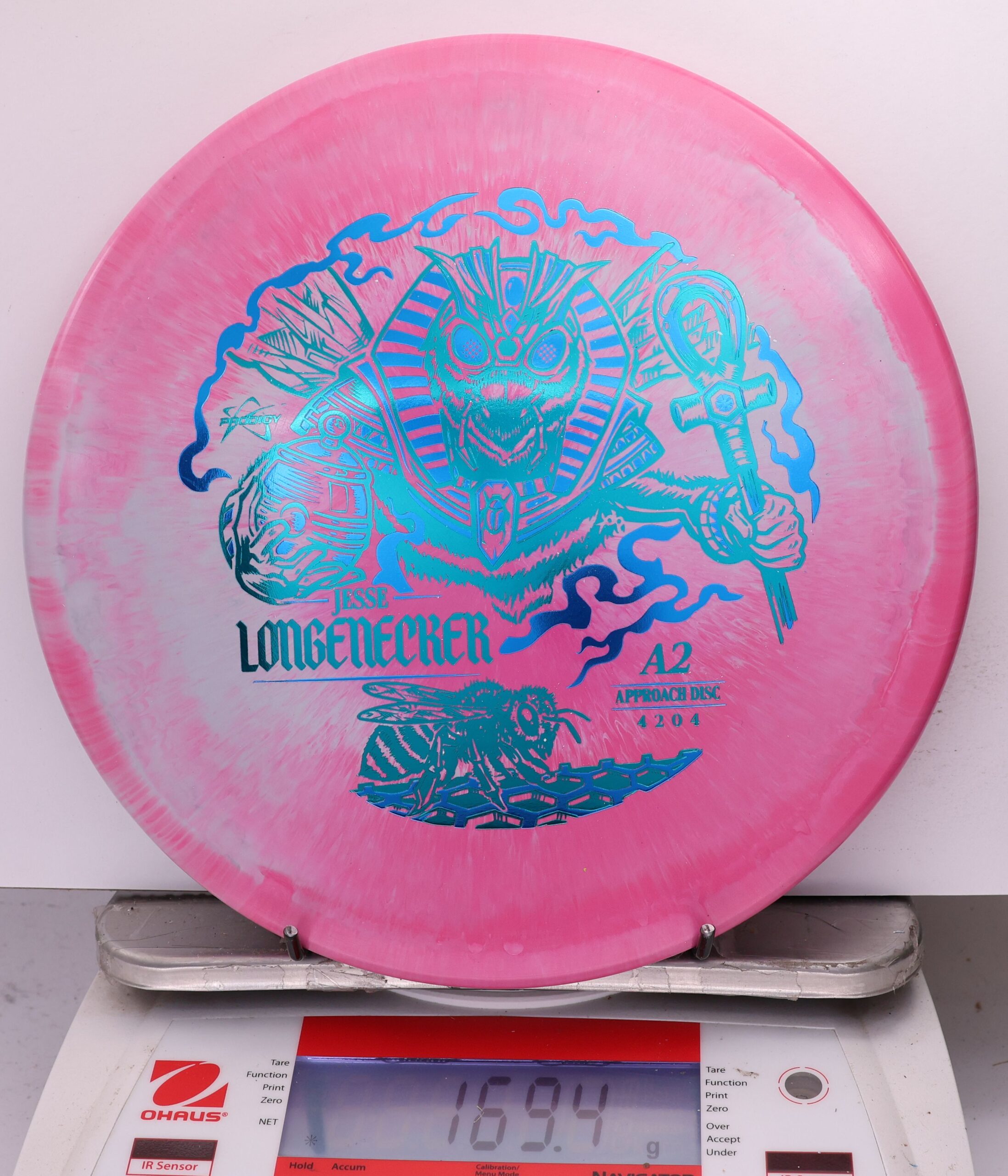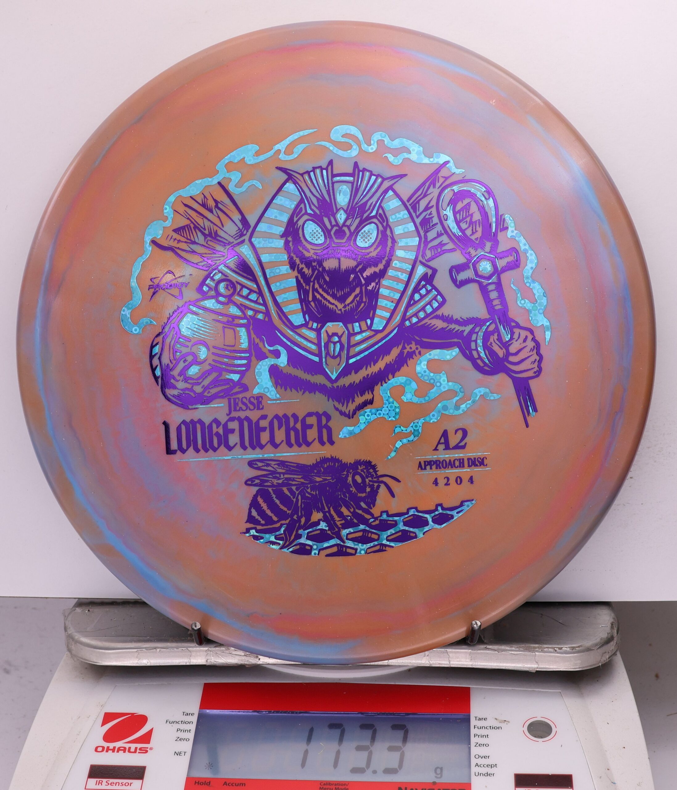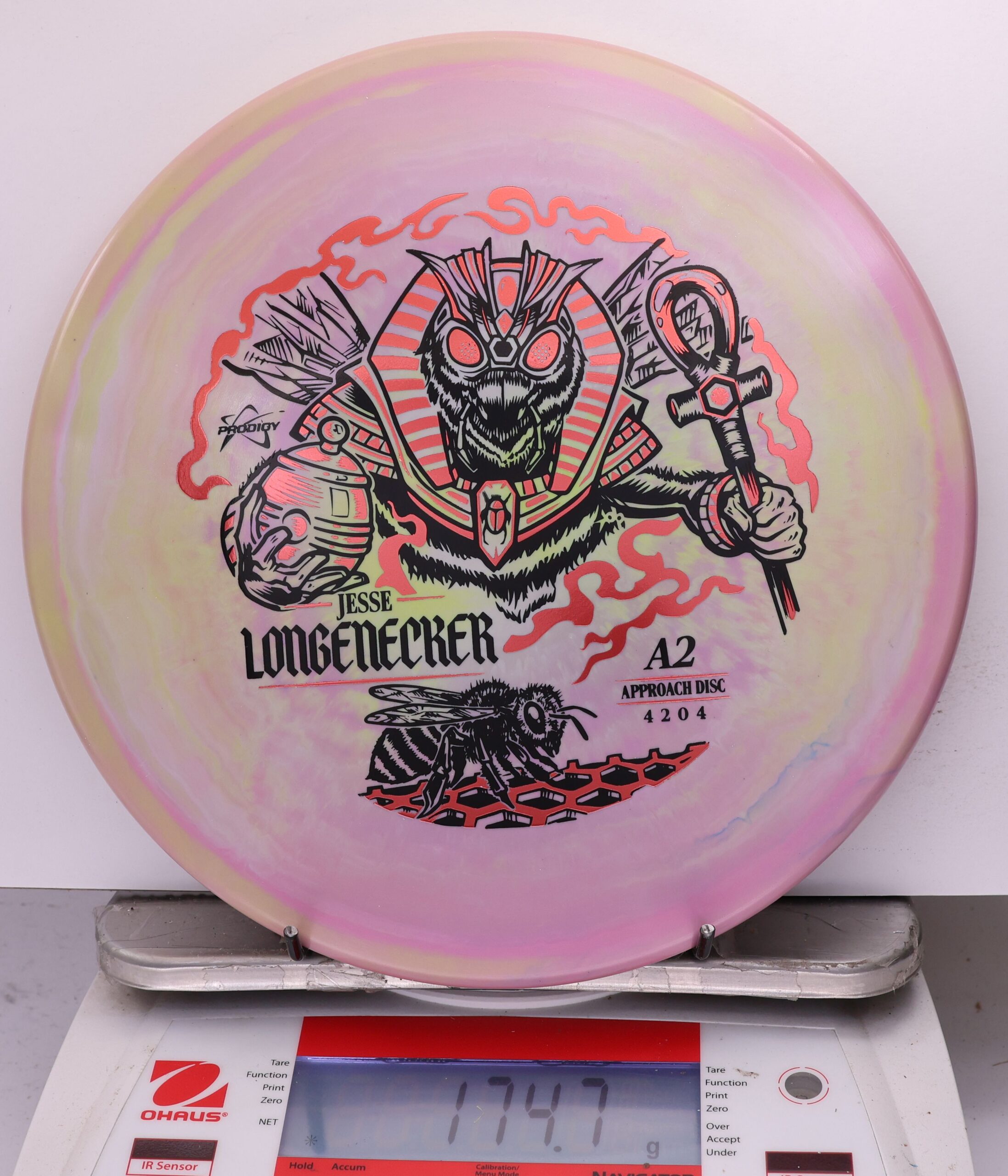 Prodigy A2 in 500 Spectrum — overstable, beaded approach disc with a flat top, torque resistance, and a strong forward fade. Longenecker 2026 Signature Series.